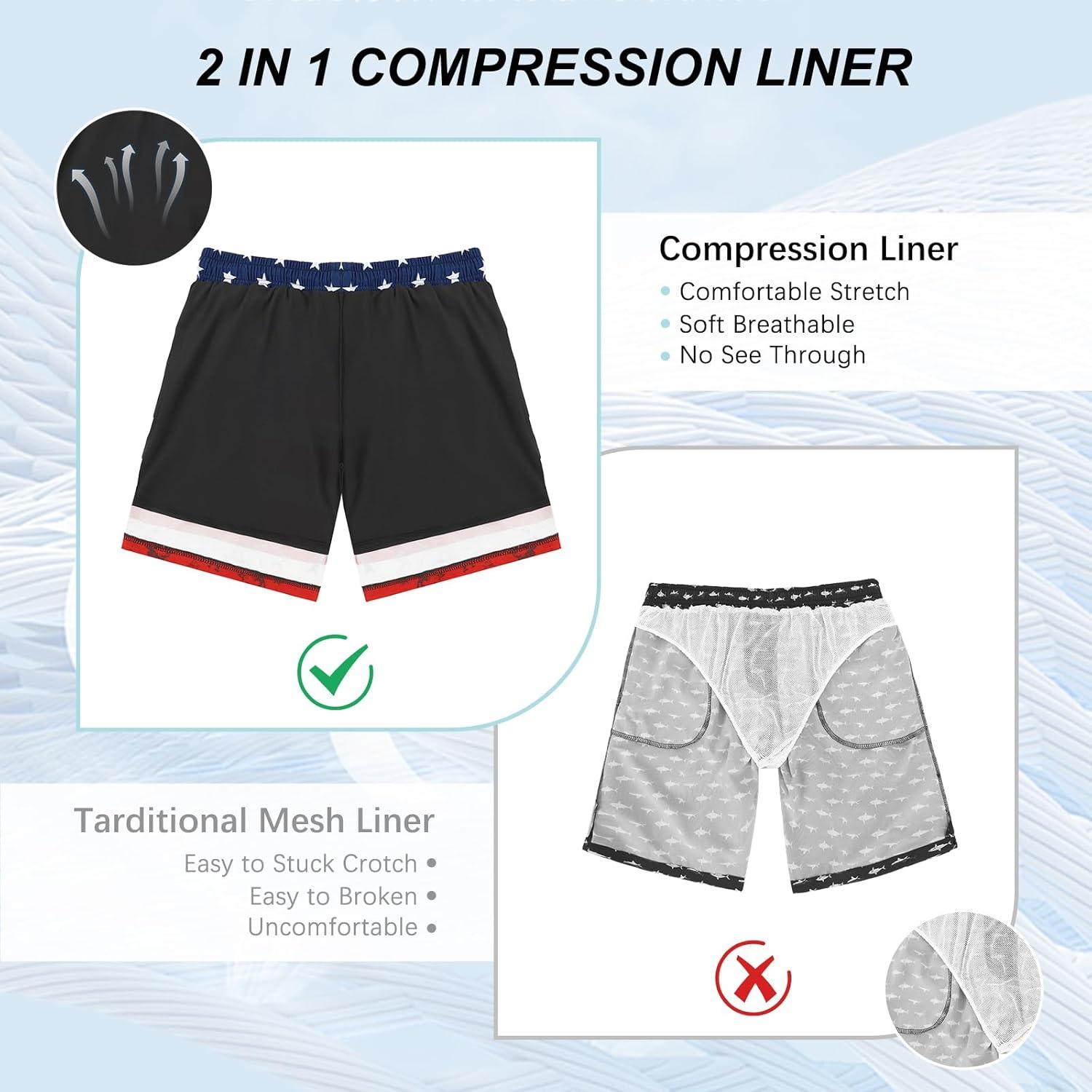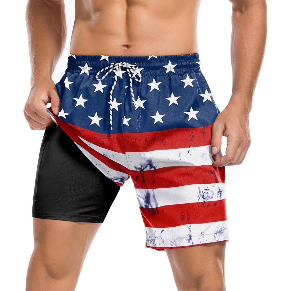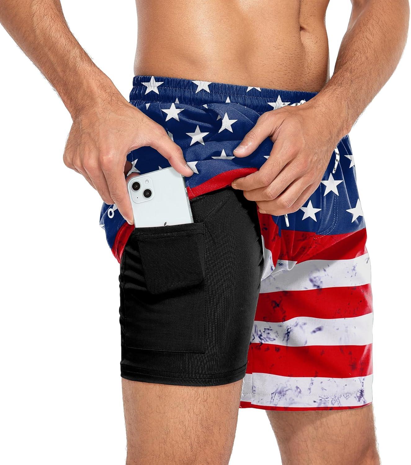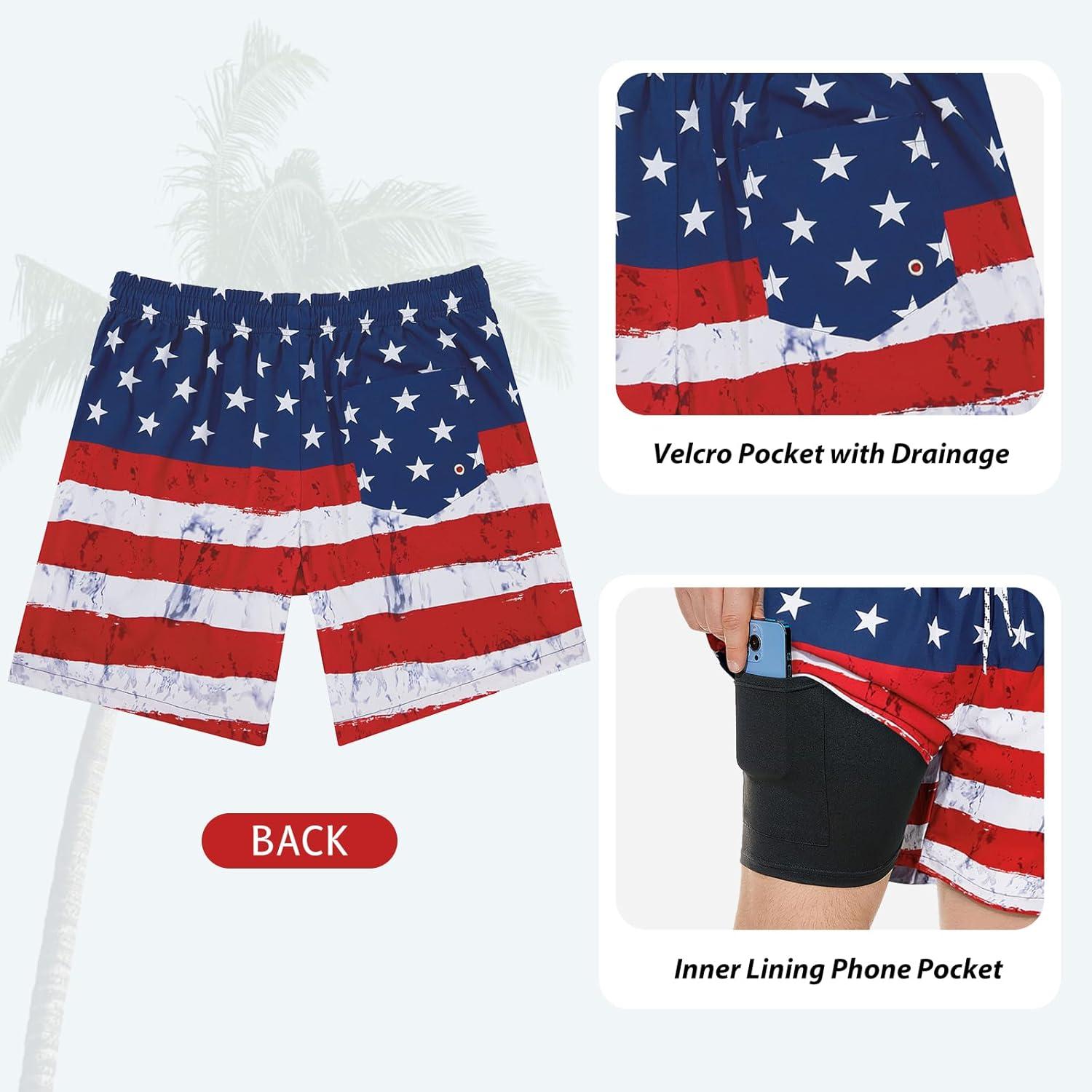 4th of July Swim Trunks Men 7inch American Flag Compression Board Shorts Swimsuits Bathing Suit Swimwear