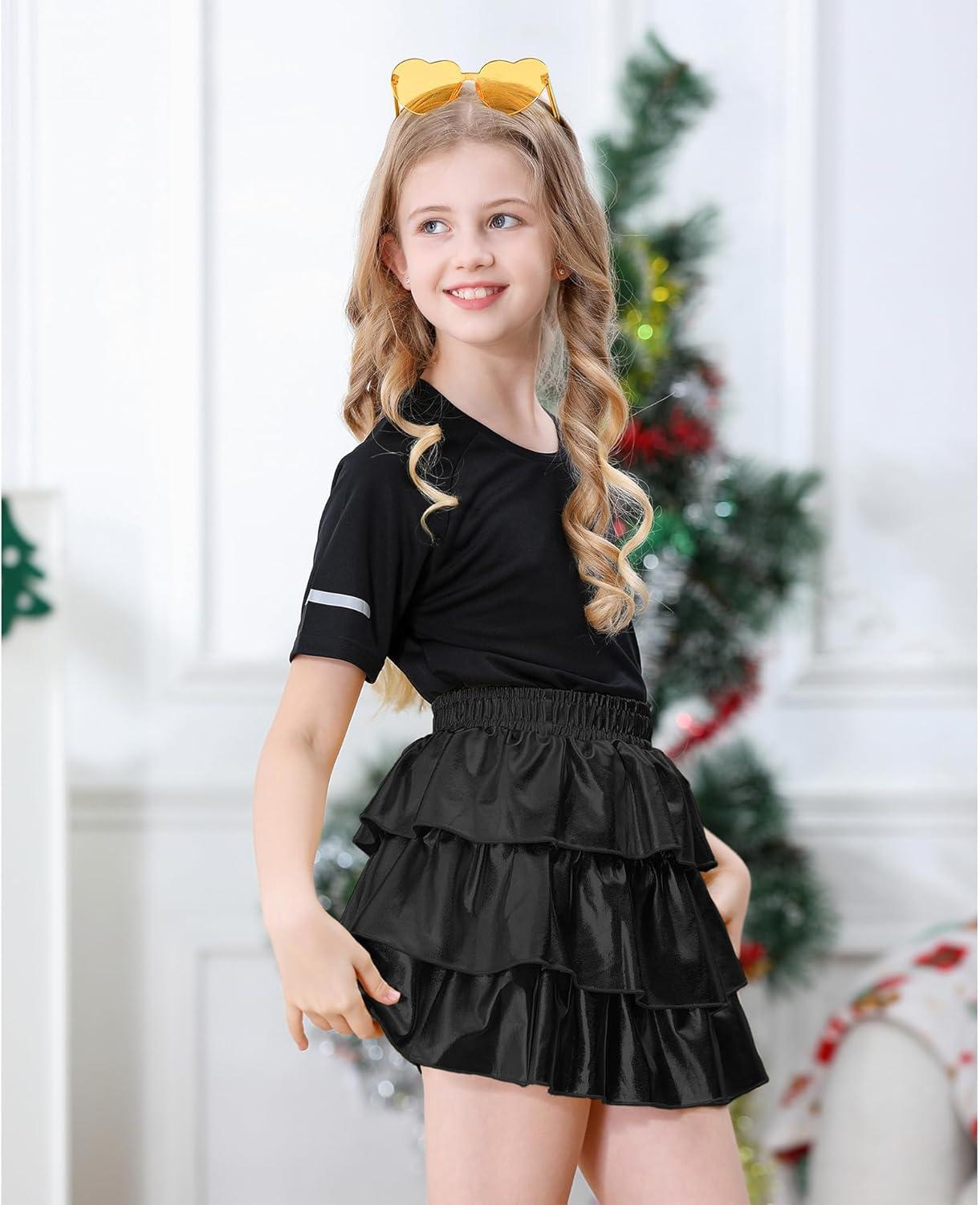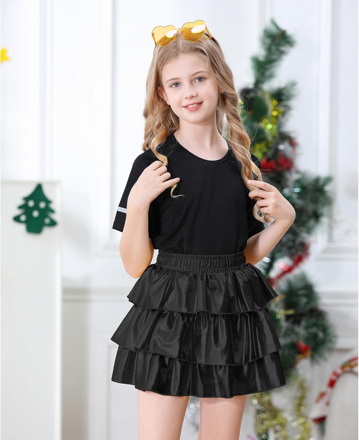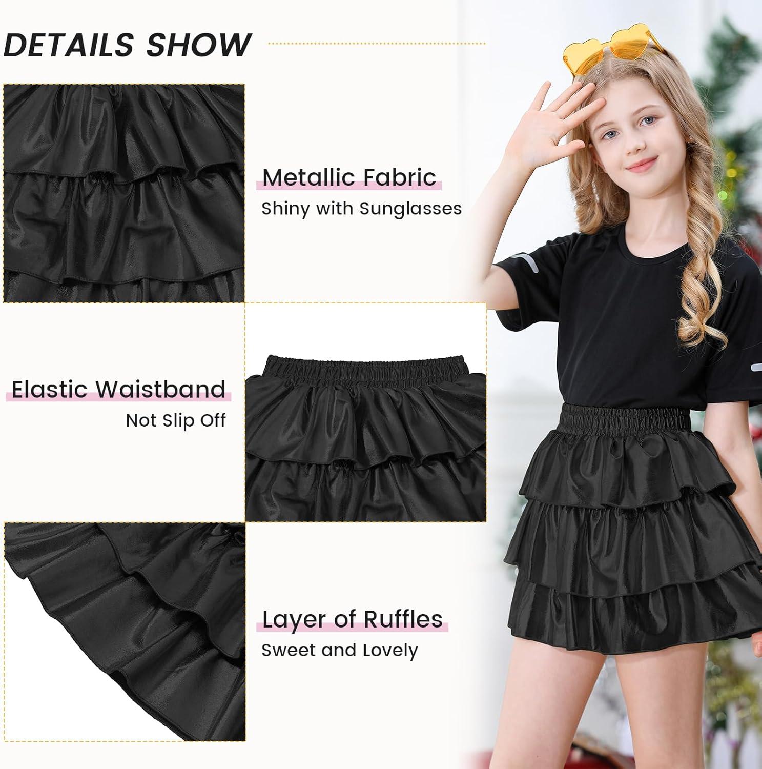American Trends Girls Metallic Skirts Kids 3-Layers Ruffle Sparkly Skirt with Sunglasses for Girl 4-15 Years(Black)