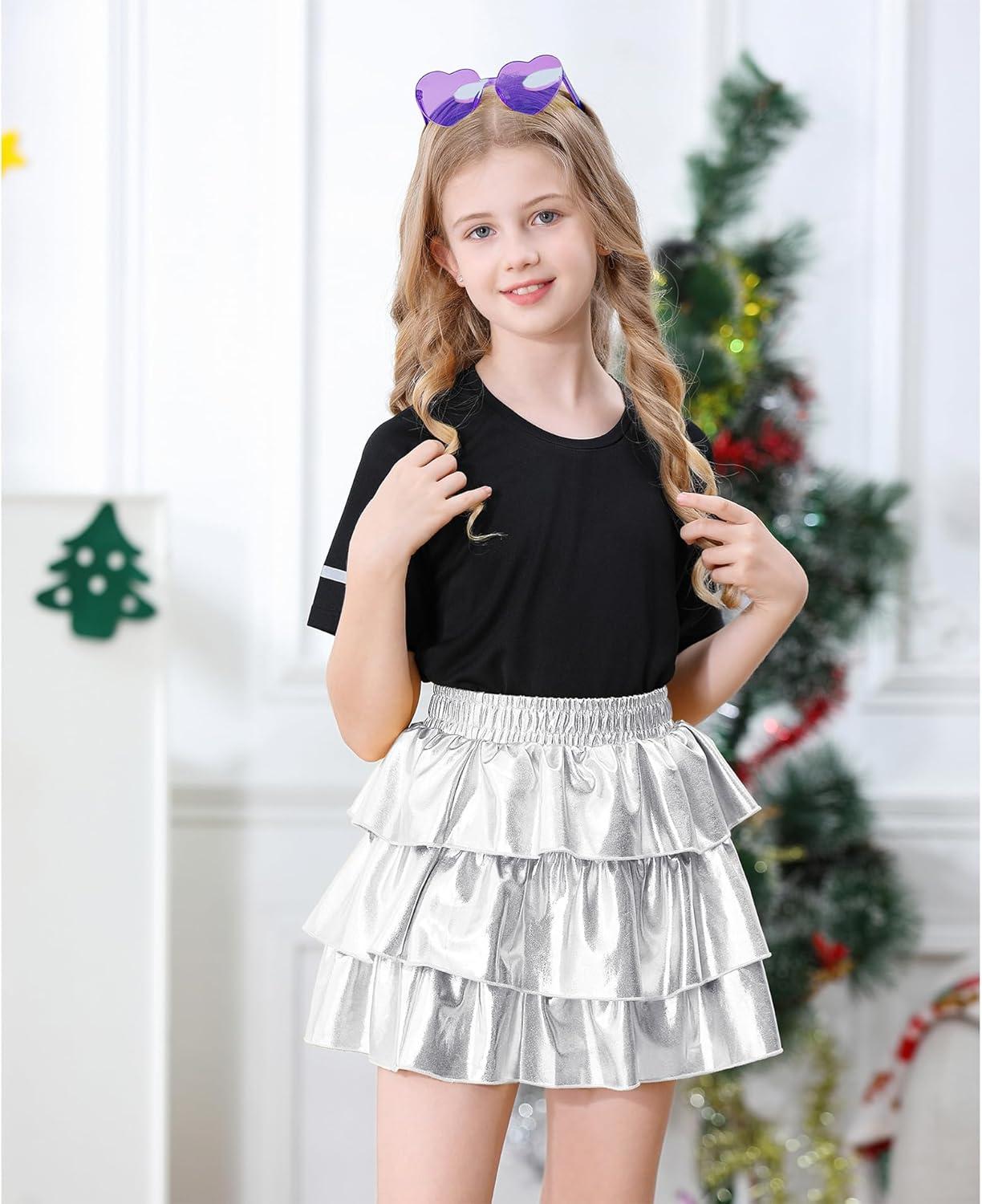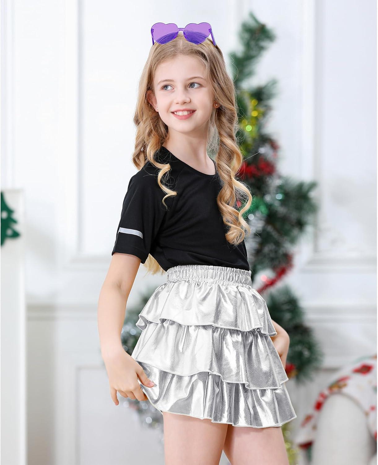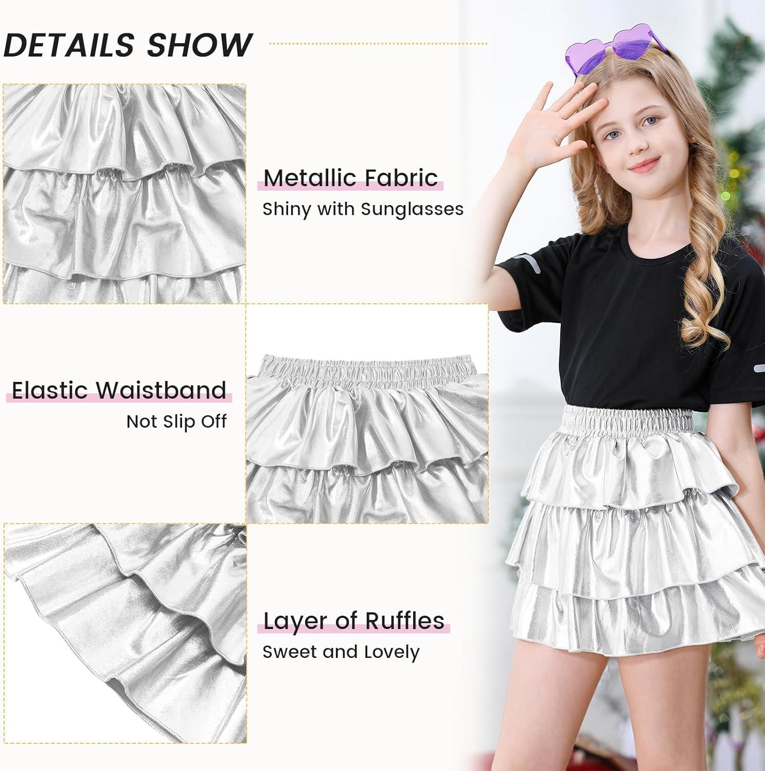 American Trends Girls Metallic Skirts Kids 3-Layers Ruffle Sparkly Skirt with Sunglasses for Girl 4-15 Years(Silver)