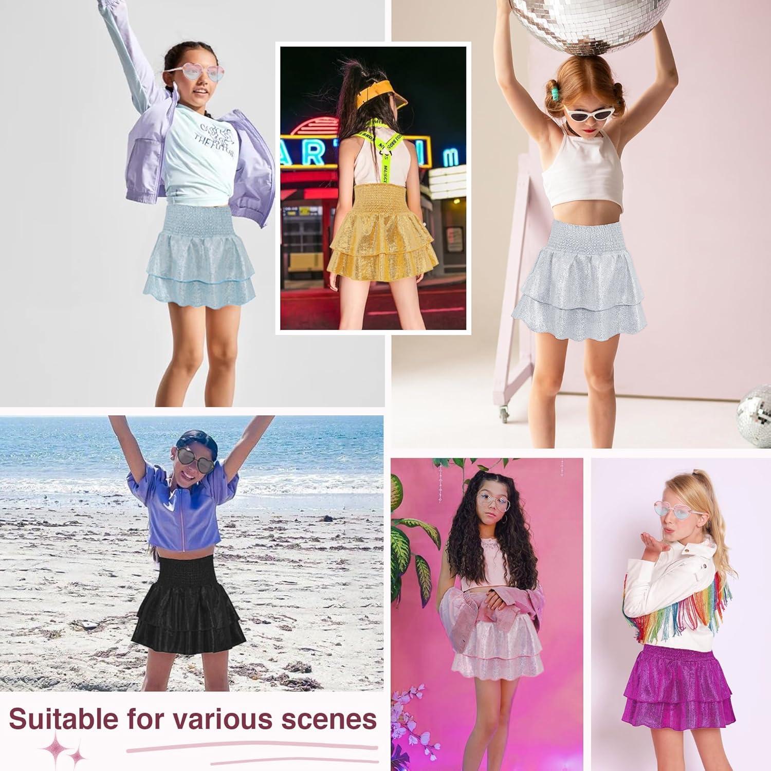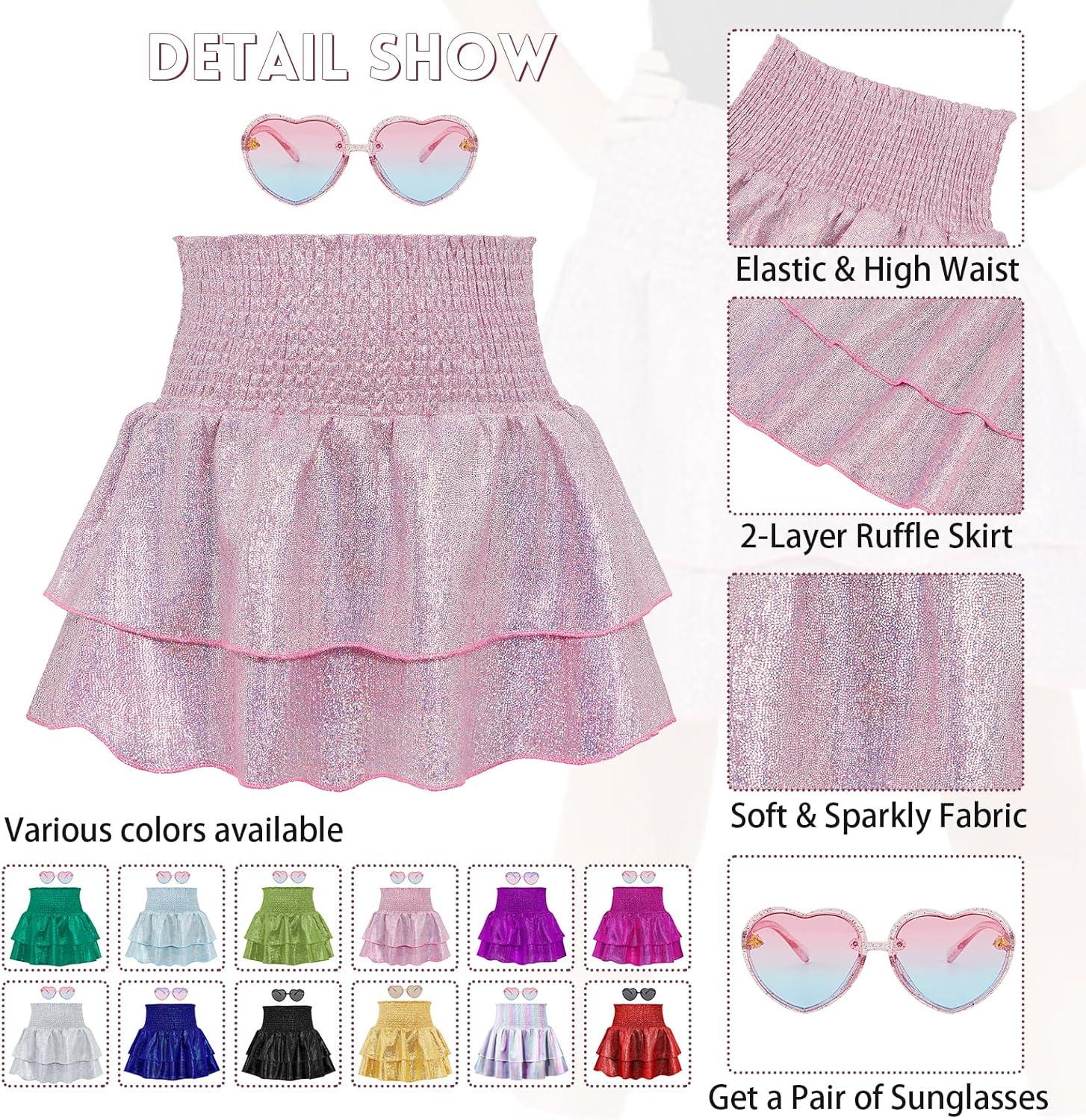 American Trends Girls Sequin Sparkly Skirts Girls Metallic Skirt 2-Layer Ruffle Skirts with Sunglasses Cheerleaders Skirt(Rainbow)