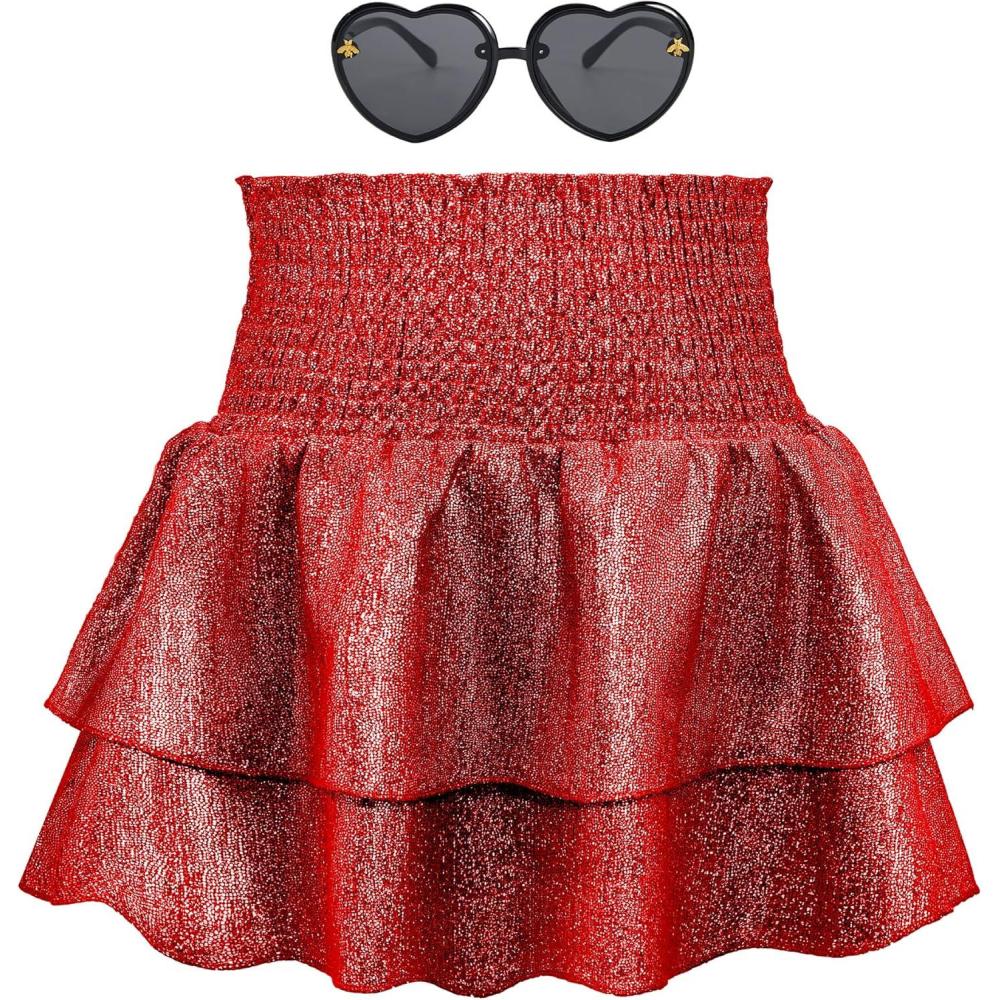 American Trends Girls Sequin Sparkly Skirts Girls Metallic Skirt 2-Layer Ruffle Skirts with Sunglasses Cheerleaders Skirt(Red)