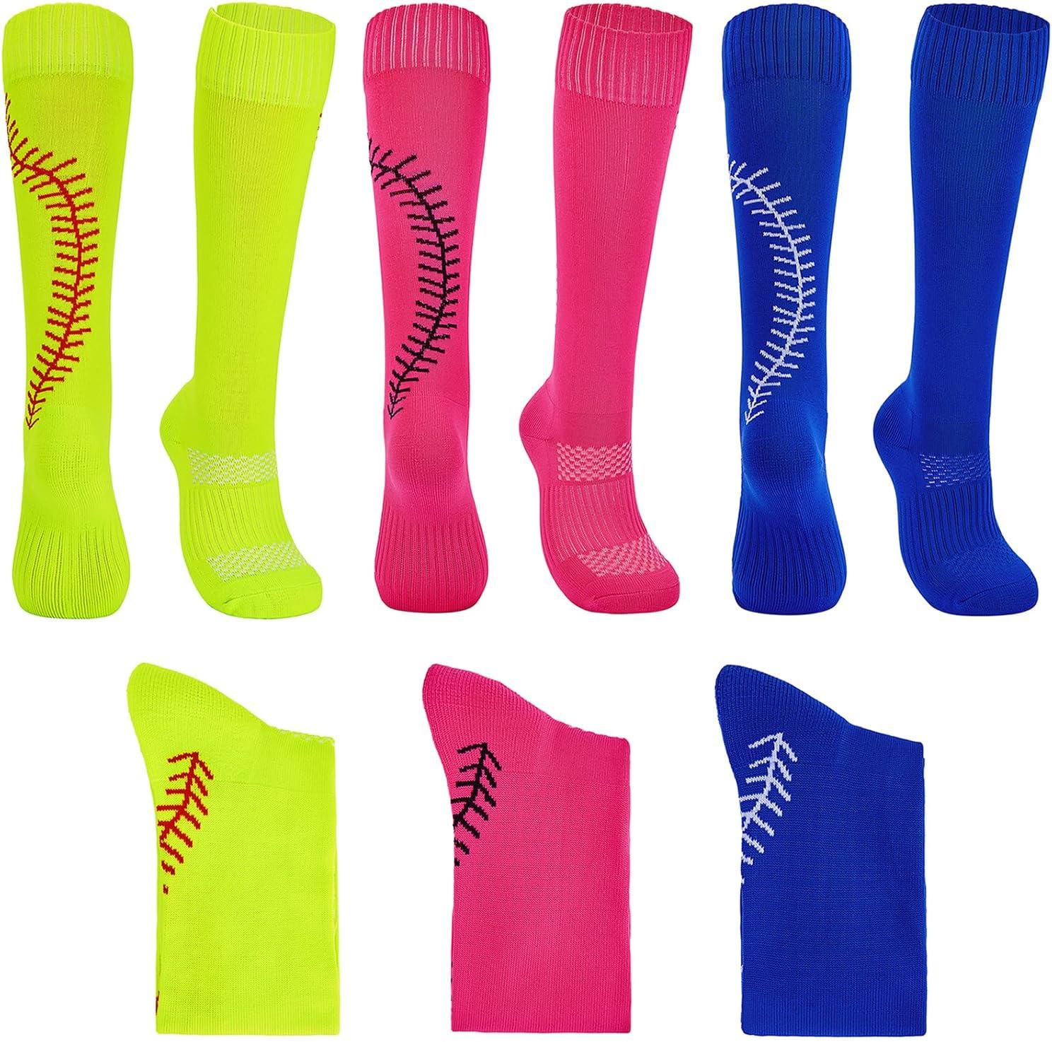American Trends Girls Softball Socks with Stitches 3 Pairs Youth Athletic Socks for Soccer, Baseball, Softball, Football(Rose Red & Yellow & Blue)