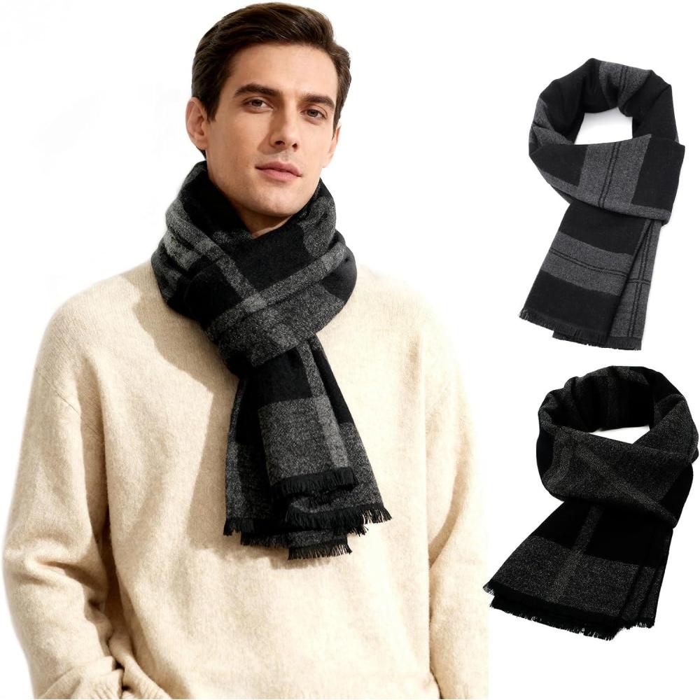 American Trends Mens Scarf Plain Solid Color Winter Scarf for Men Unisex Tassel Warm Soft Scarfs(Black Grey&black Grey Square)
