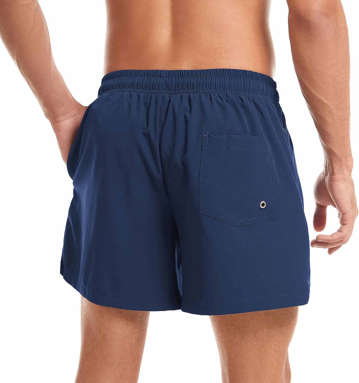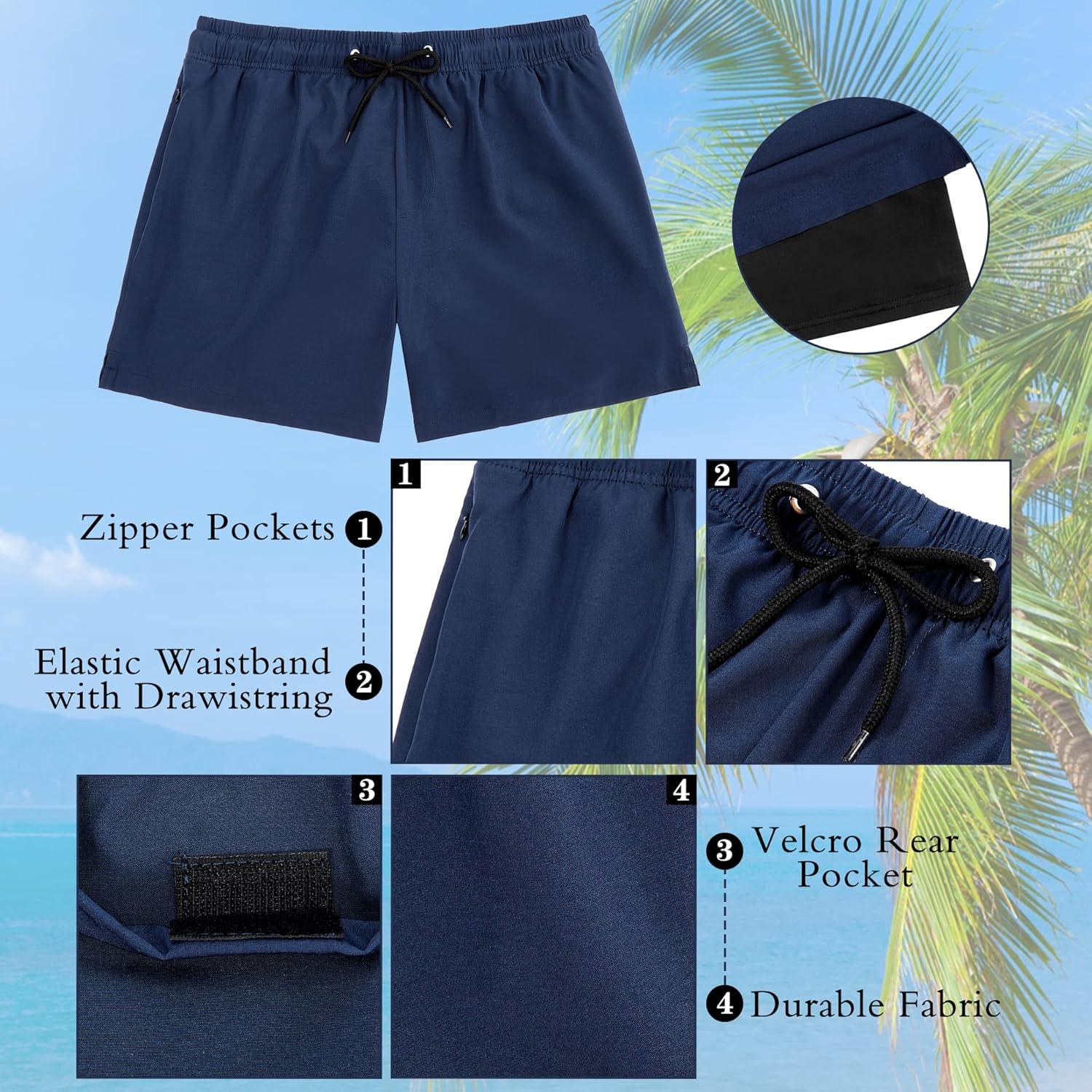 Swim Shorts with Pockets:Two side pockets and back pocket not only store your belongings but also accelerate water flow for quick drying. Moreover, board shorts have a liner pocket for extra storage.