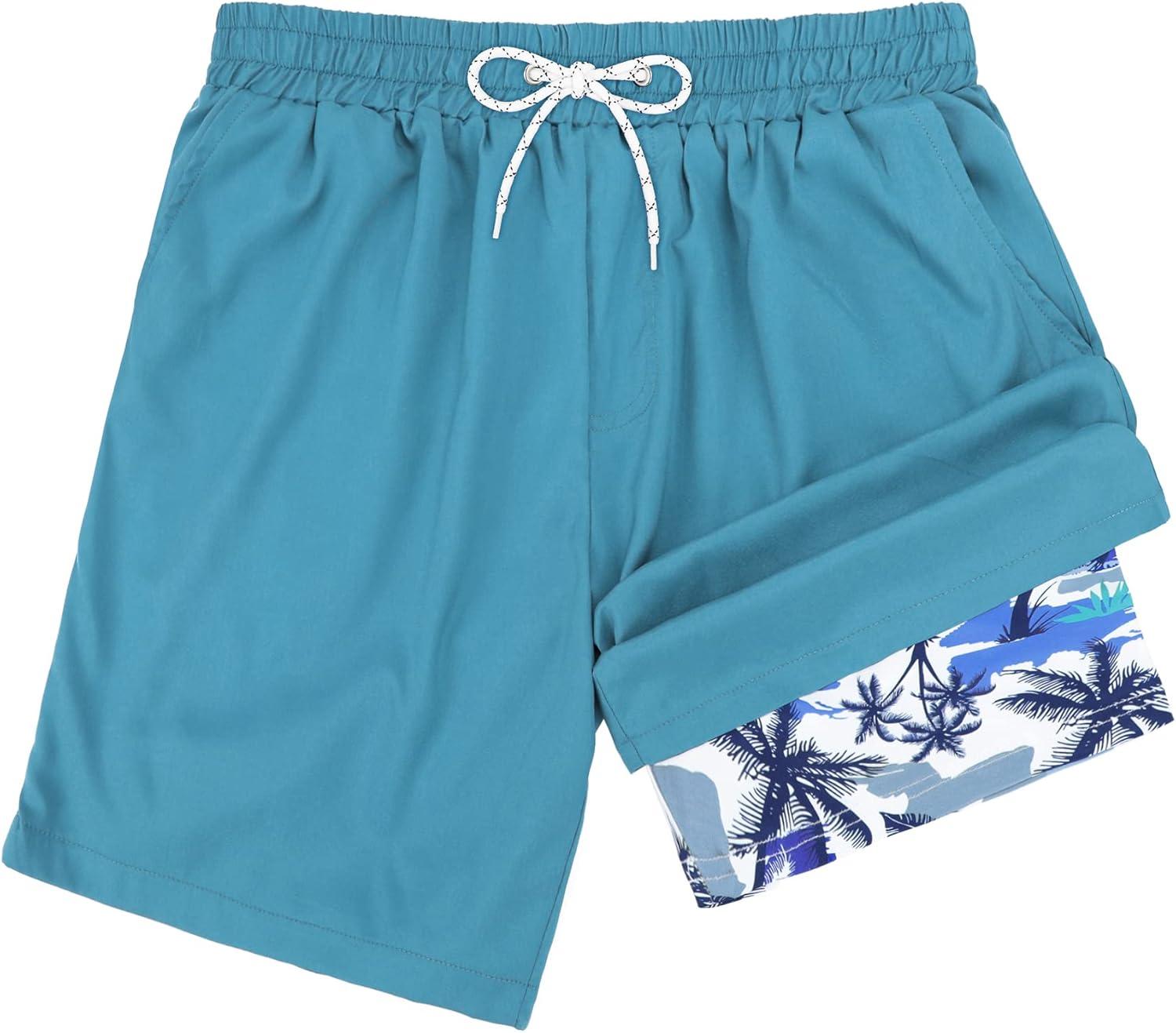 American Trends Mens Swim Trunks with Compression Liner Board Shorts for Men Quick Dry Swimsuits Bathing Suit Swimwear M-XXL(Blue Coconut Tree)