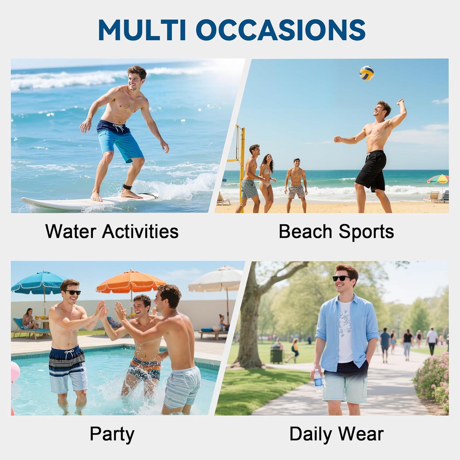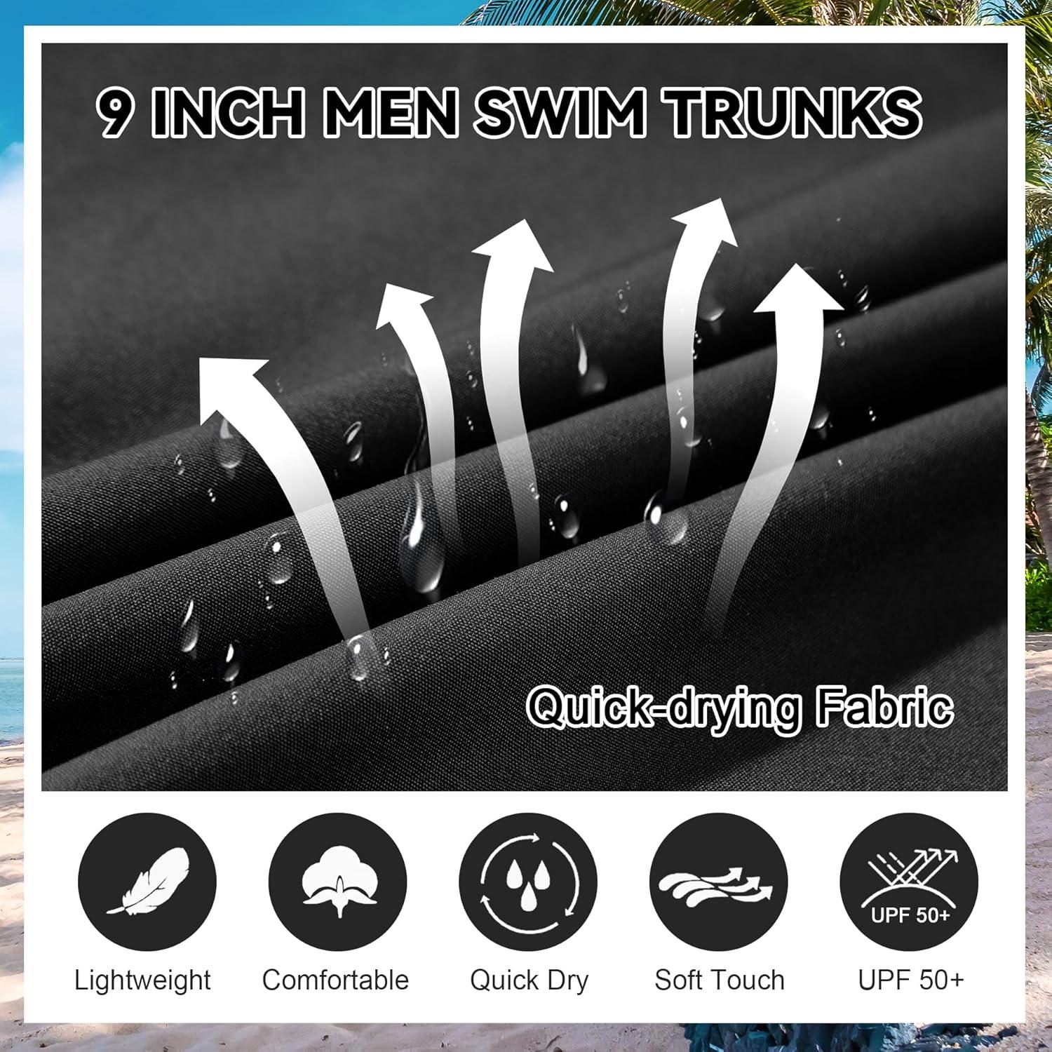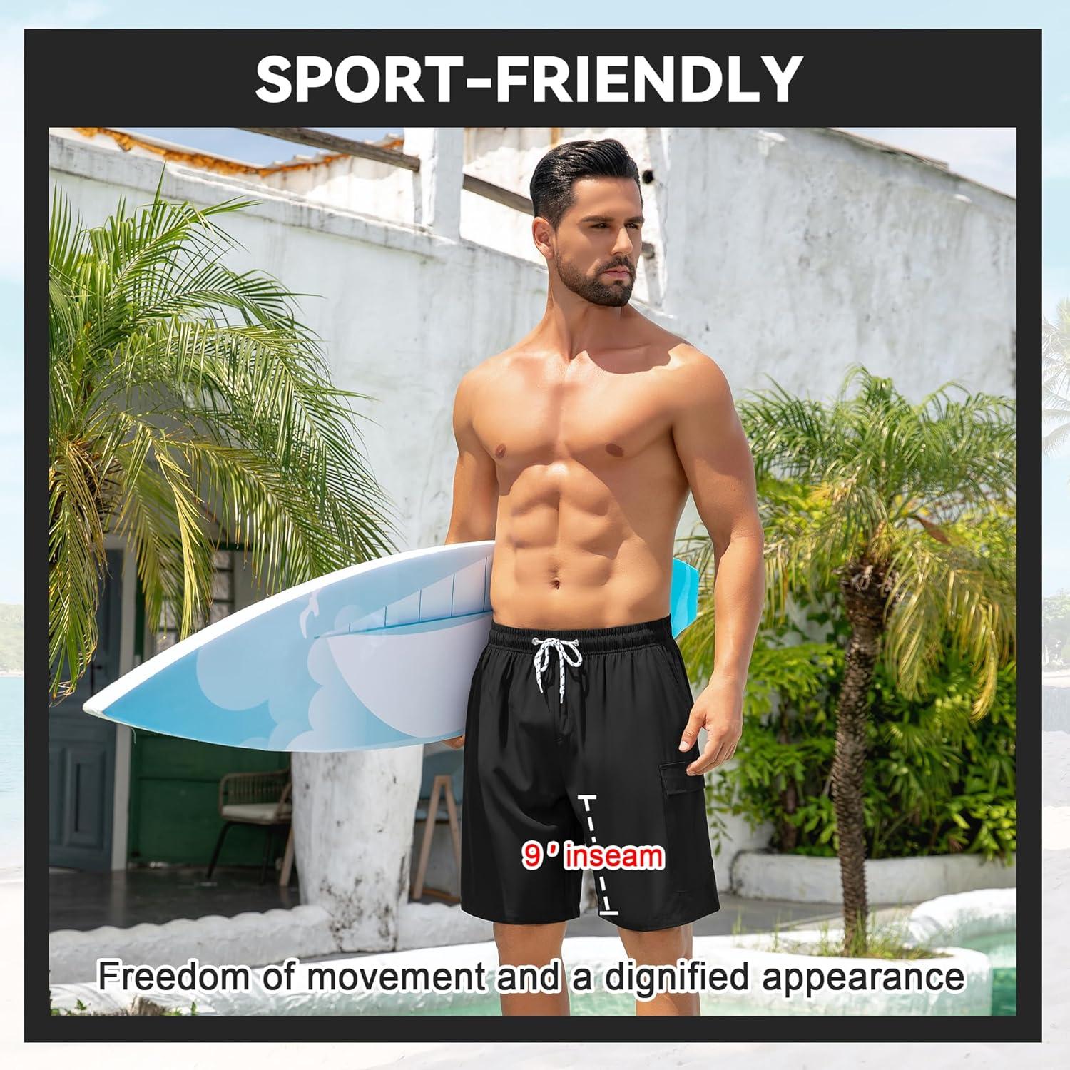 Swim Shorts with Pockets:Two side pockets and back pocket not only store your belongings but also accelerate water flow for quick drying. Moreover, board shorts have a liner pocket for extra storage.