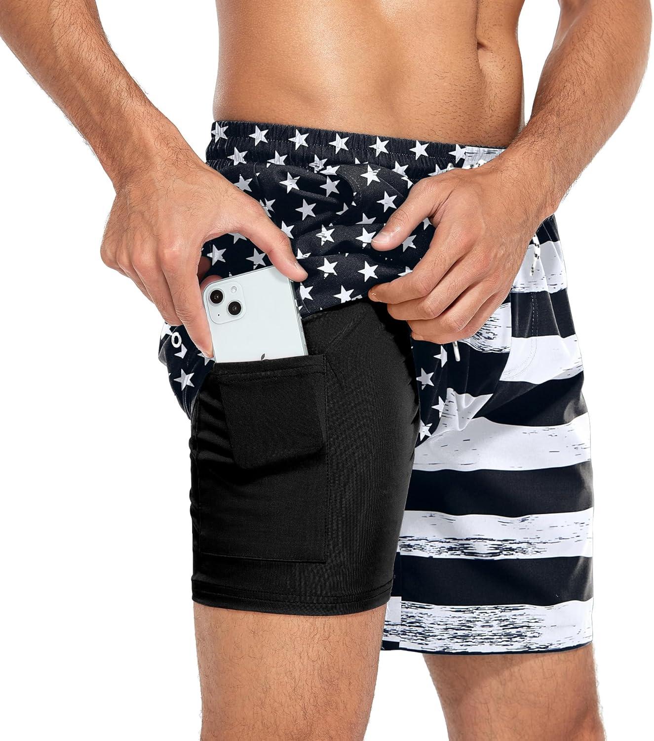 American Trends Mens Swim Trunks with Compression Liner Qucik Dry Board Shorts 2 in 1 Men’s Swimsuits(7″black White American Flag)