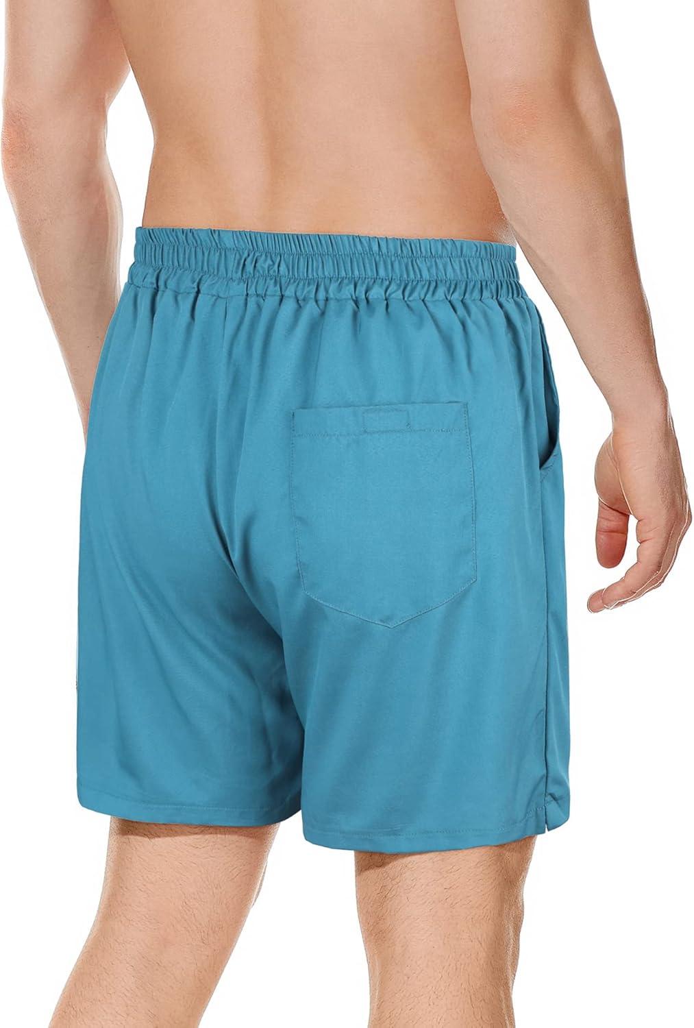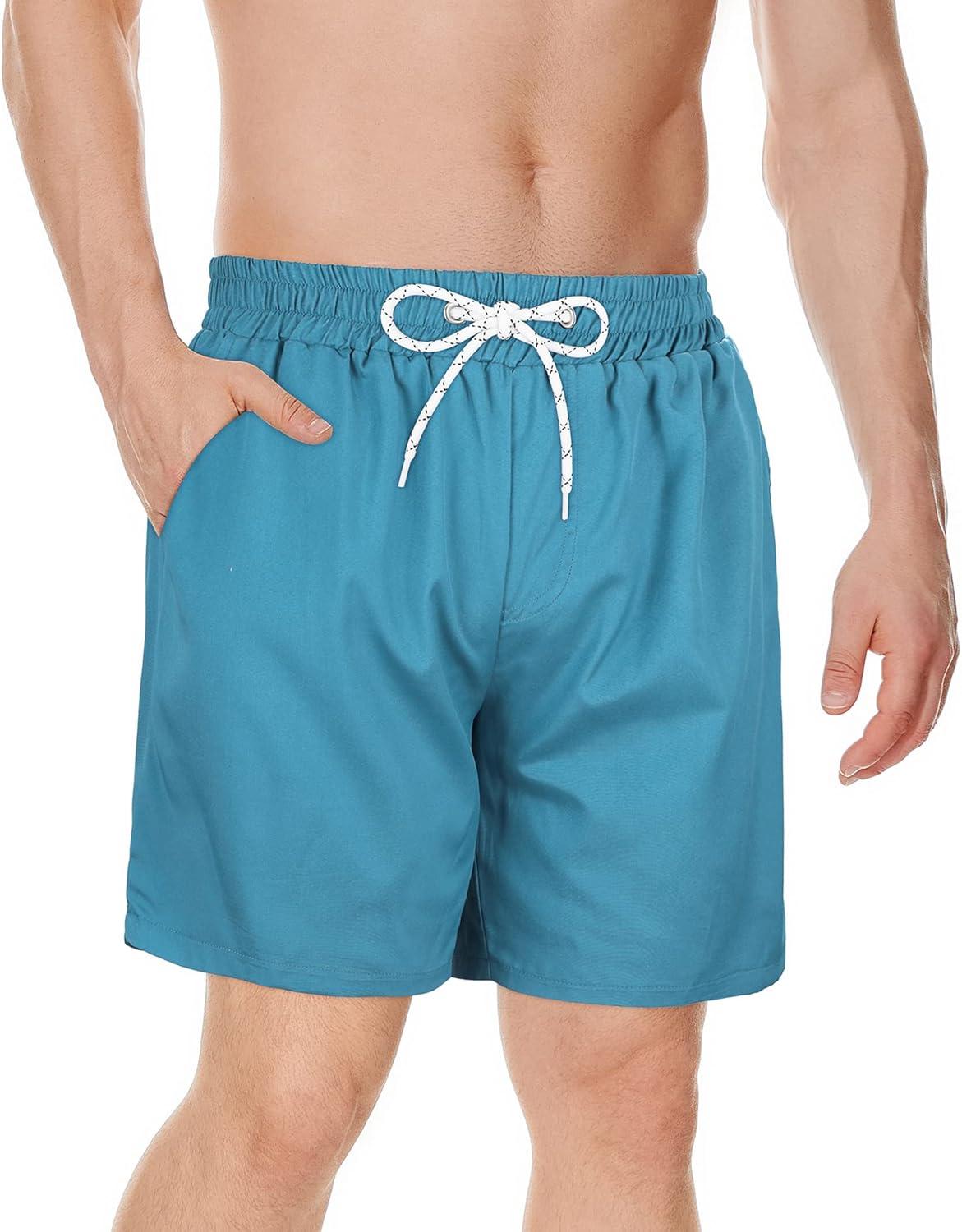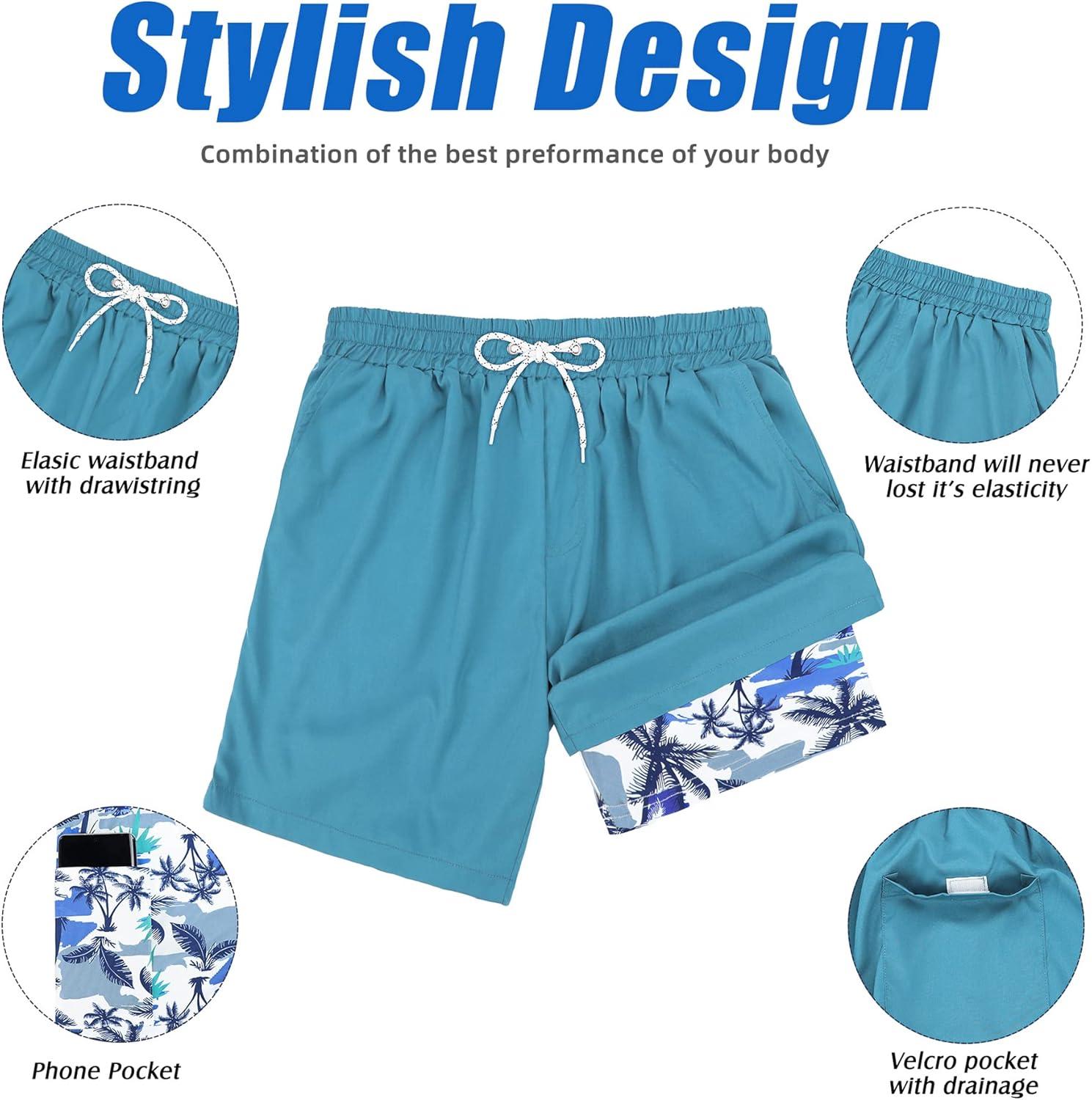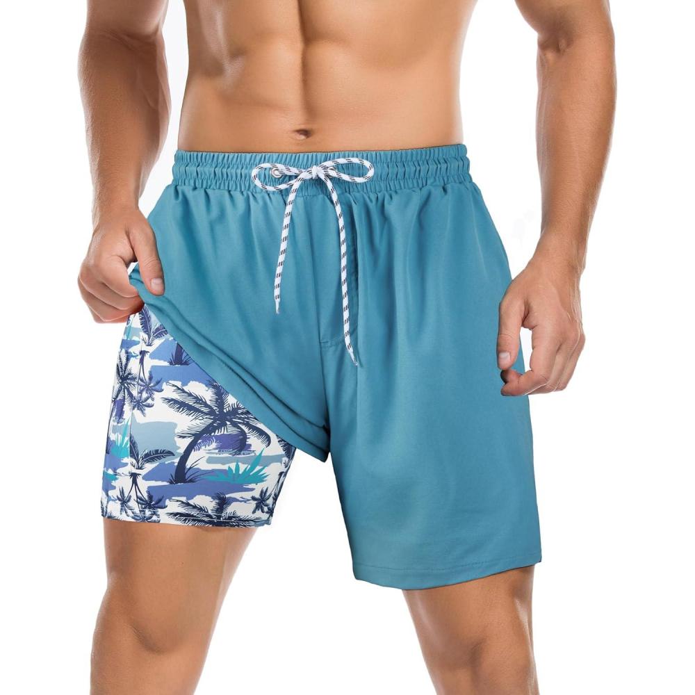 American Trends Mens Swim Trunks with Compression Liner Qucik Dry Board Shorts 2 in 1 Men’s Swimsuits(7″blue Coconut Tree)