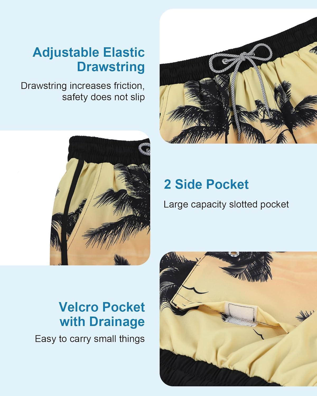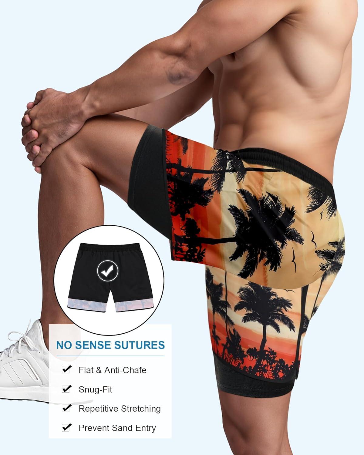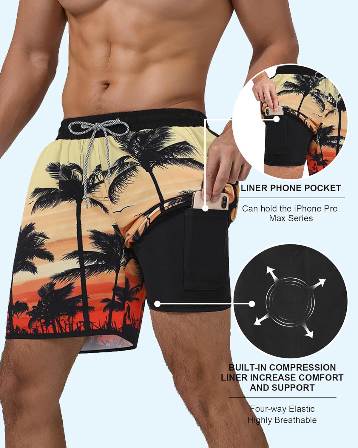 American Trends Mens Swim Trunks with Compression Liner Qucik Dry Board Shorts 2 in 1 Men’s Swimsuits(Coconut Tree)