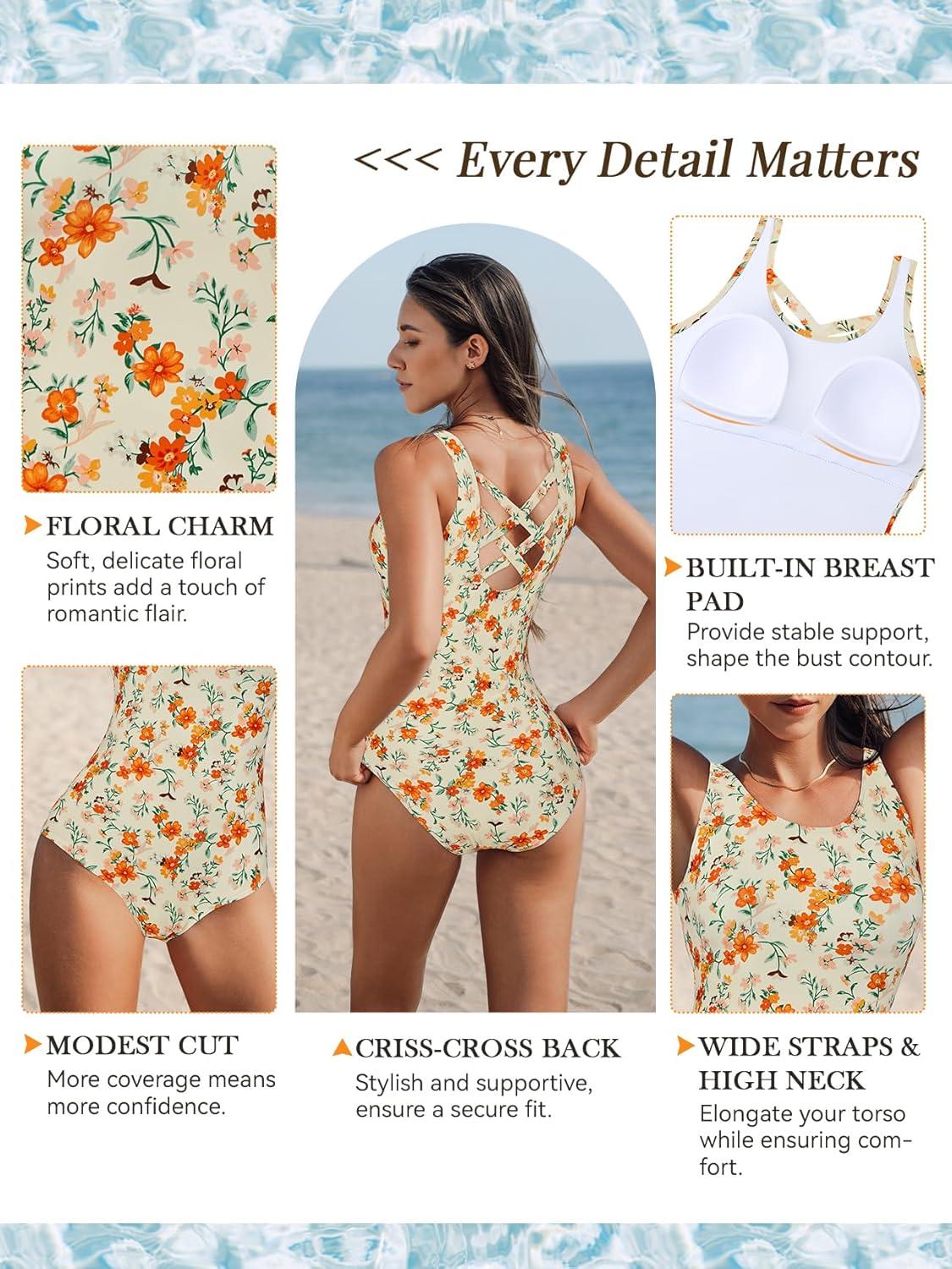 American Trends Modest Criss Cross Back One Piece Swimsuit Women Full Coverage Floral Print Long Torso Swim Suits(B White Flowers)