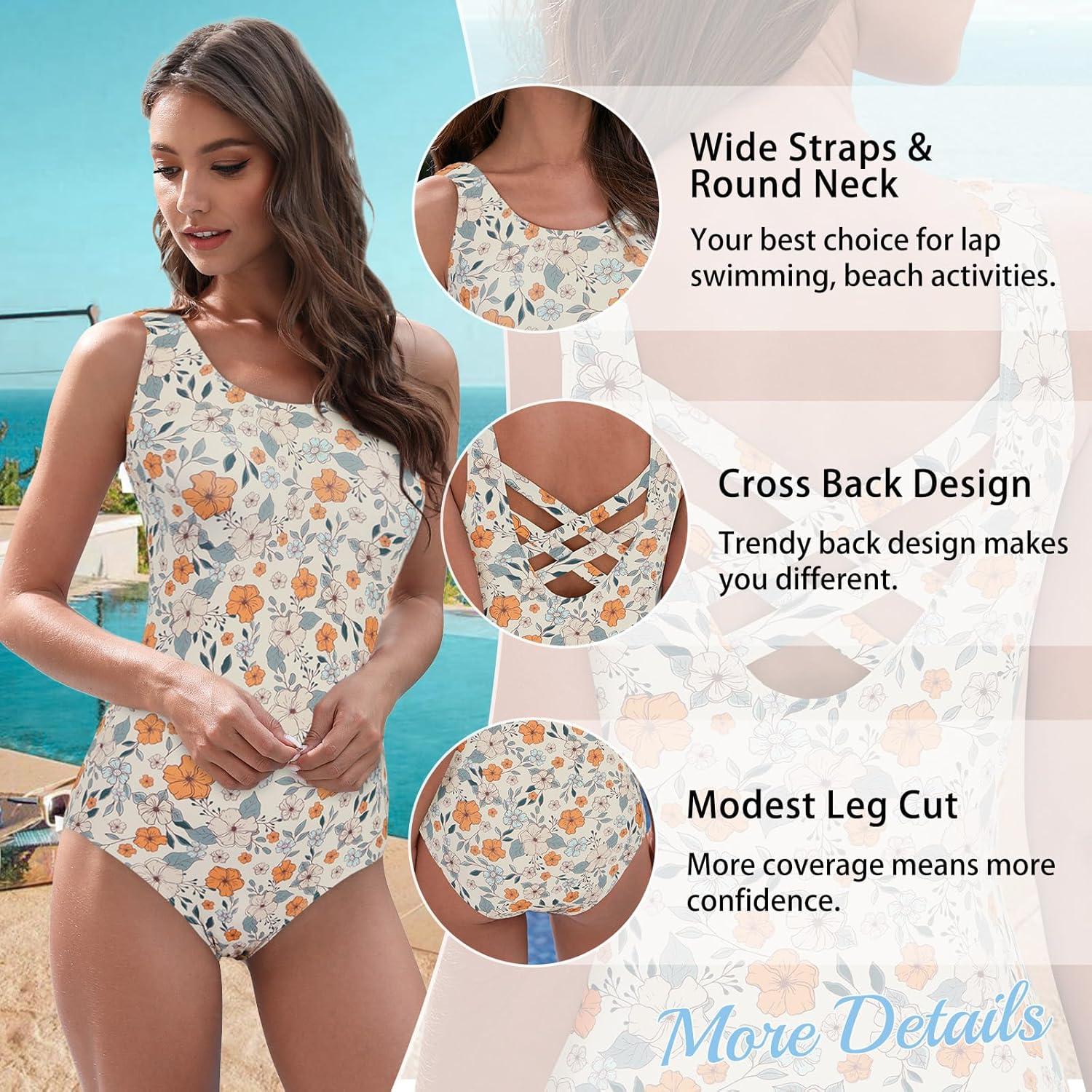 American Trends Modest One Piece Swimsuit Women Bathing Suit Teen Girls Swim Suit Full Coverage Swimsuit Criss Cross Back(Orange Flower Print)