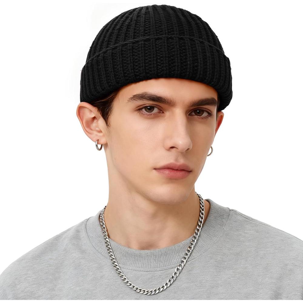 Fisherman Beanie Mens Winter Hat – Stretch Fit Skull Cap Warm Knit Hats for Skiing, Hiking, Camping(A-black)