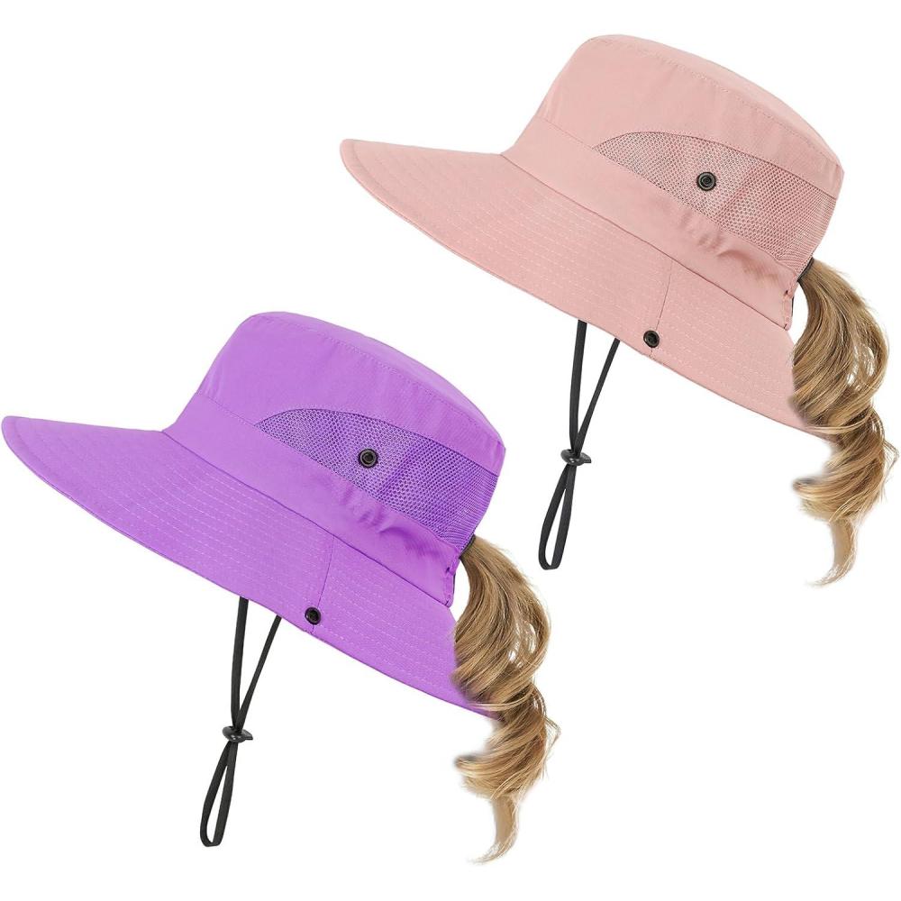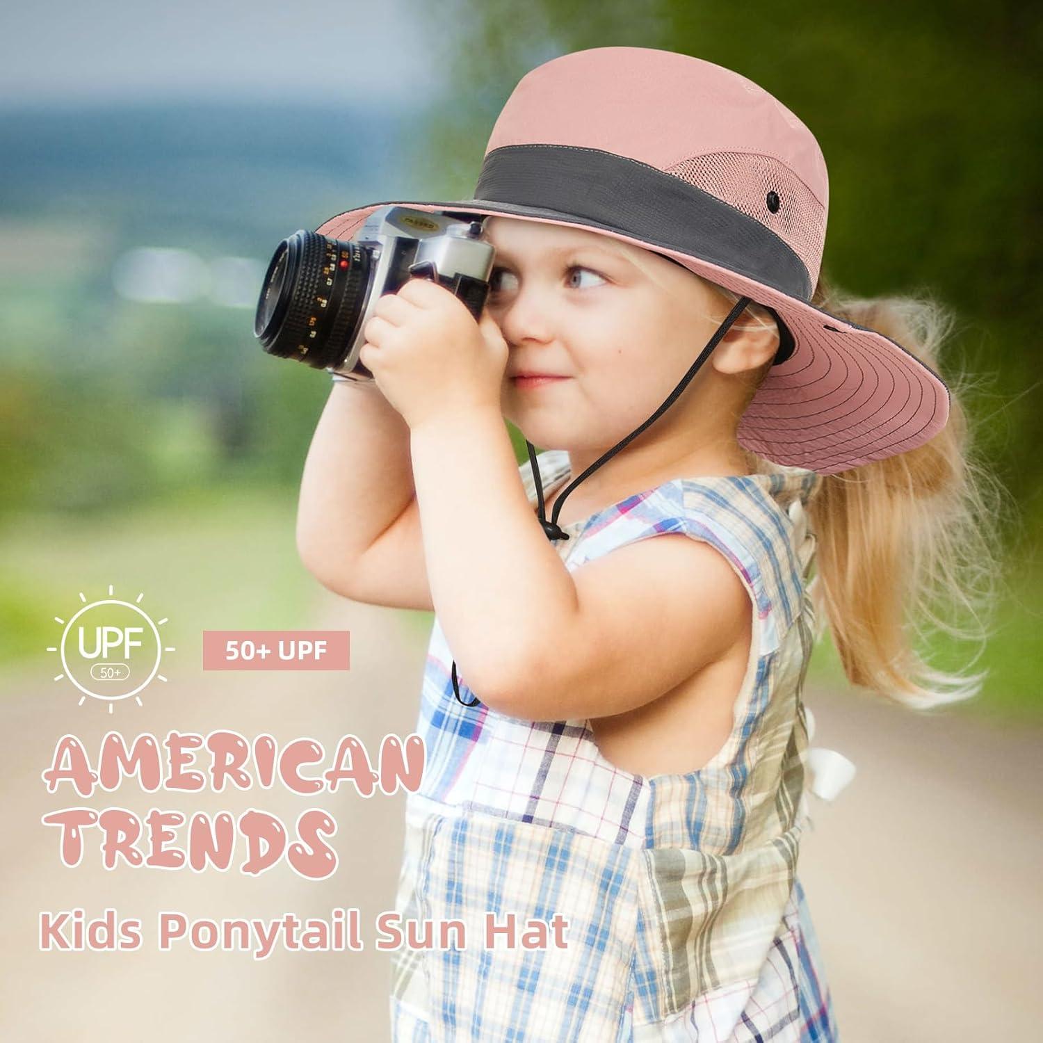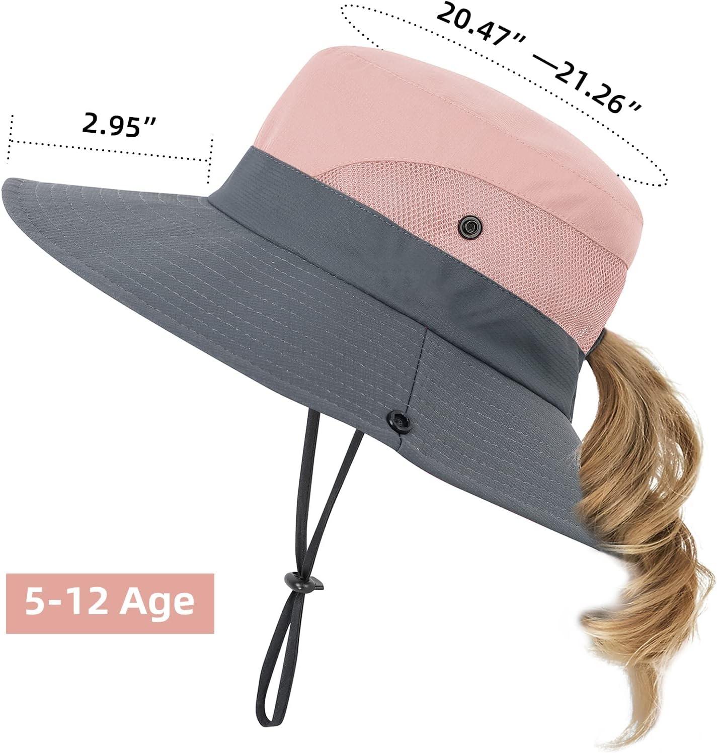 Kids Sun Hat with Ponytail Hole UV Protection Wide Brim Summer Beach Bucket Cap Fishing Hat for Girls(Pure Purple&pure Pink)