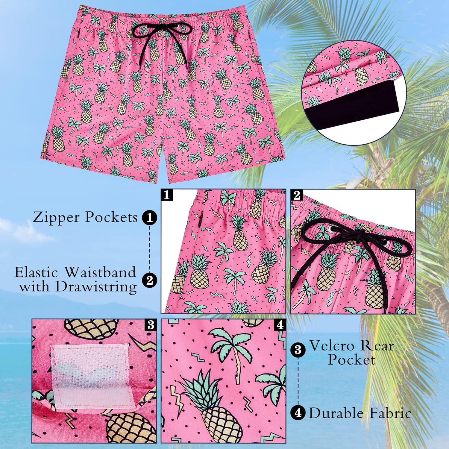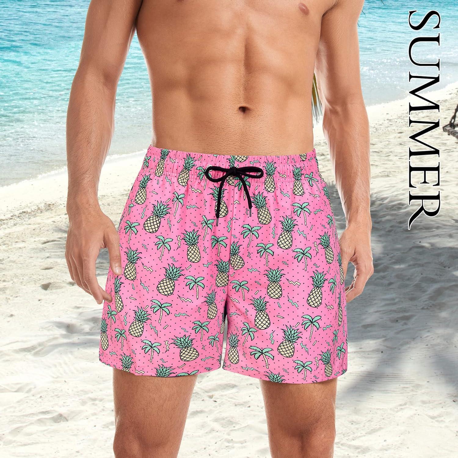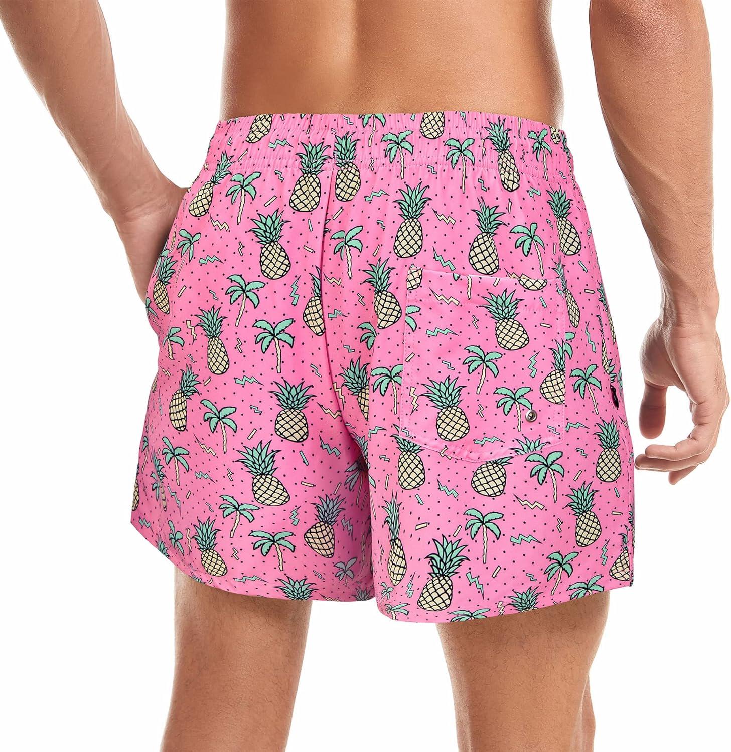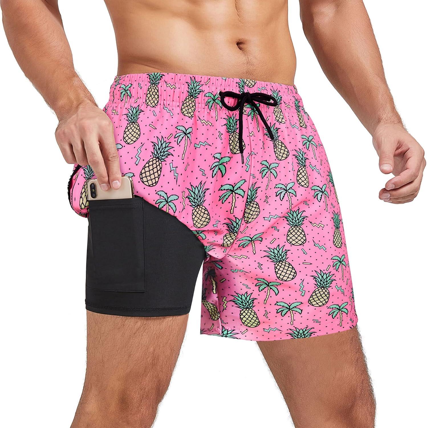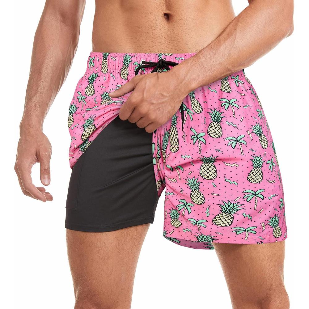 Mens Swim Trunks with Compression Liner Board Shorts for Men Quick Dry Swimsuits Bathing Suit Swimwear M-XXL(5″ Pink Pineapple)