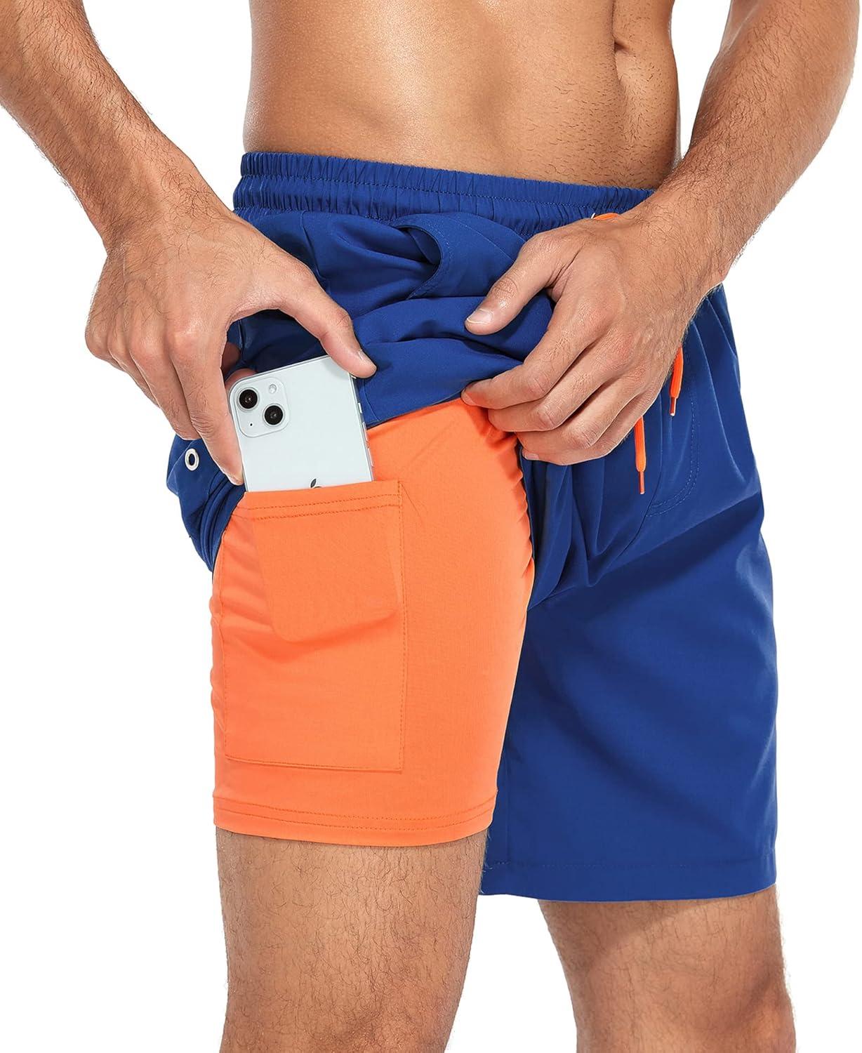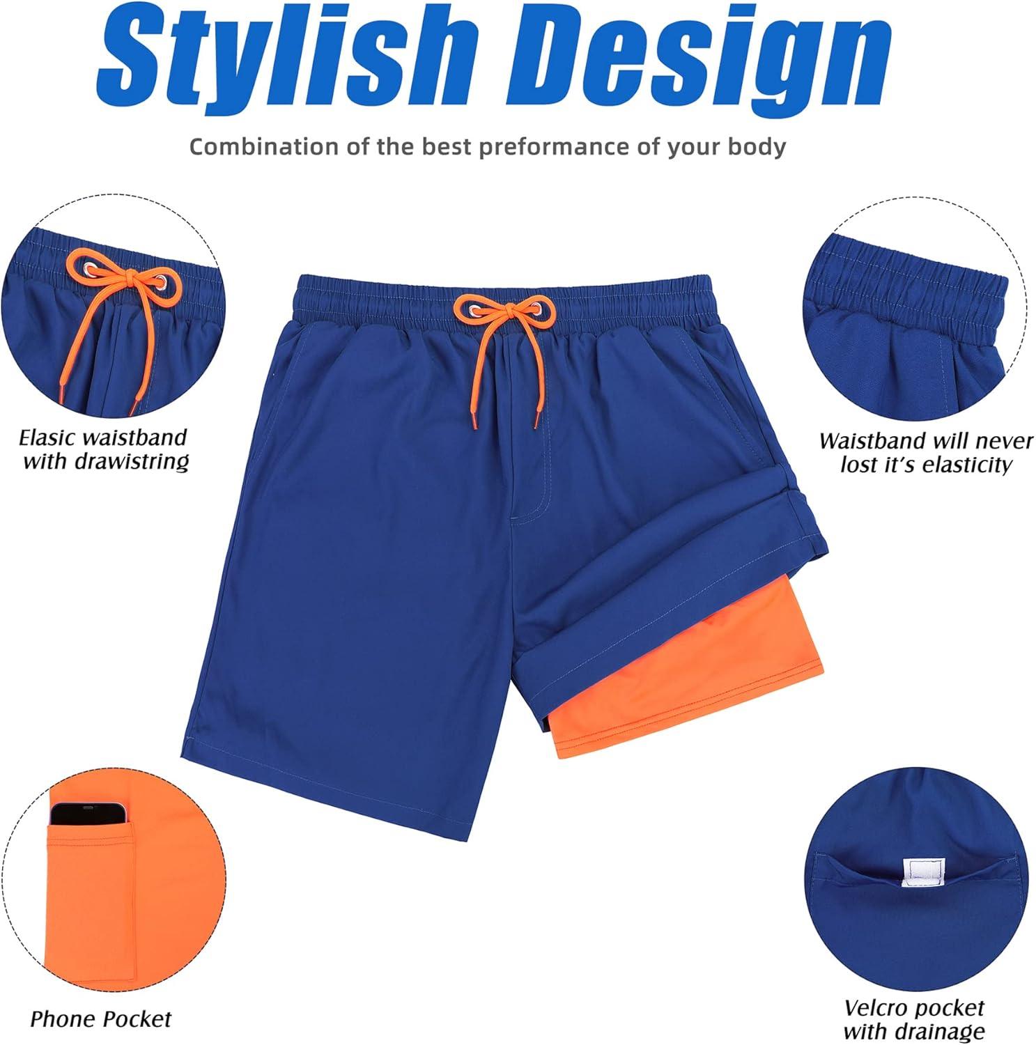 Mens Swim Trunks with Compression Liner Board Shorts for Men Quick Dry Swimsuits Bathing Suit Swimwear M-XXL(7″navy Blue)
