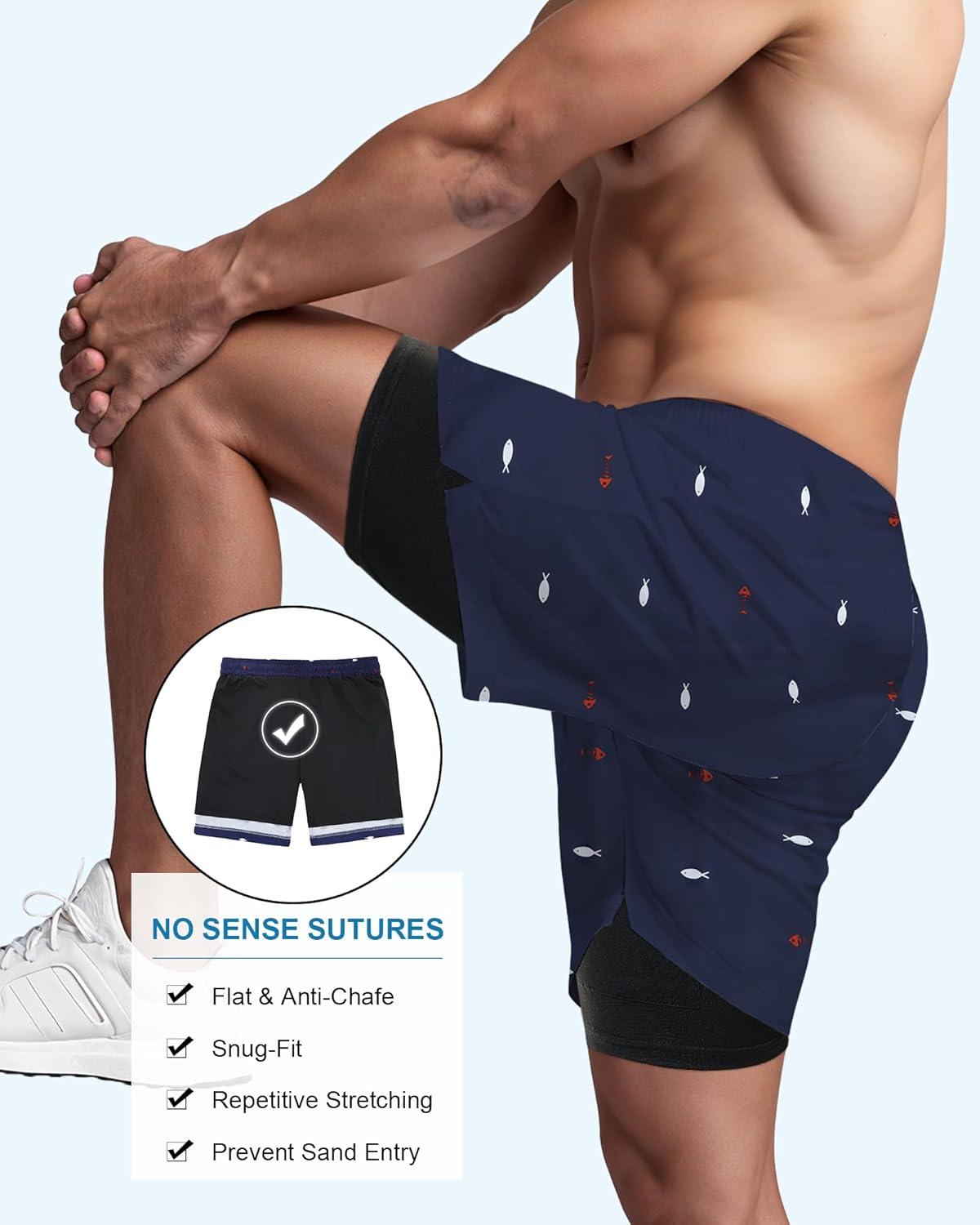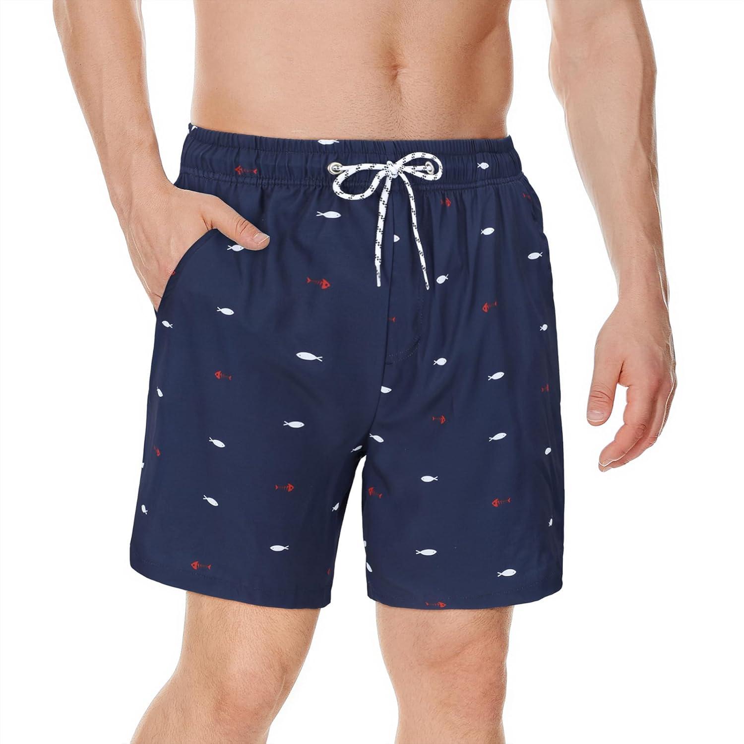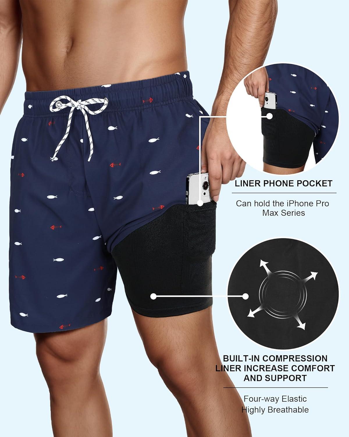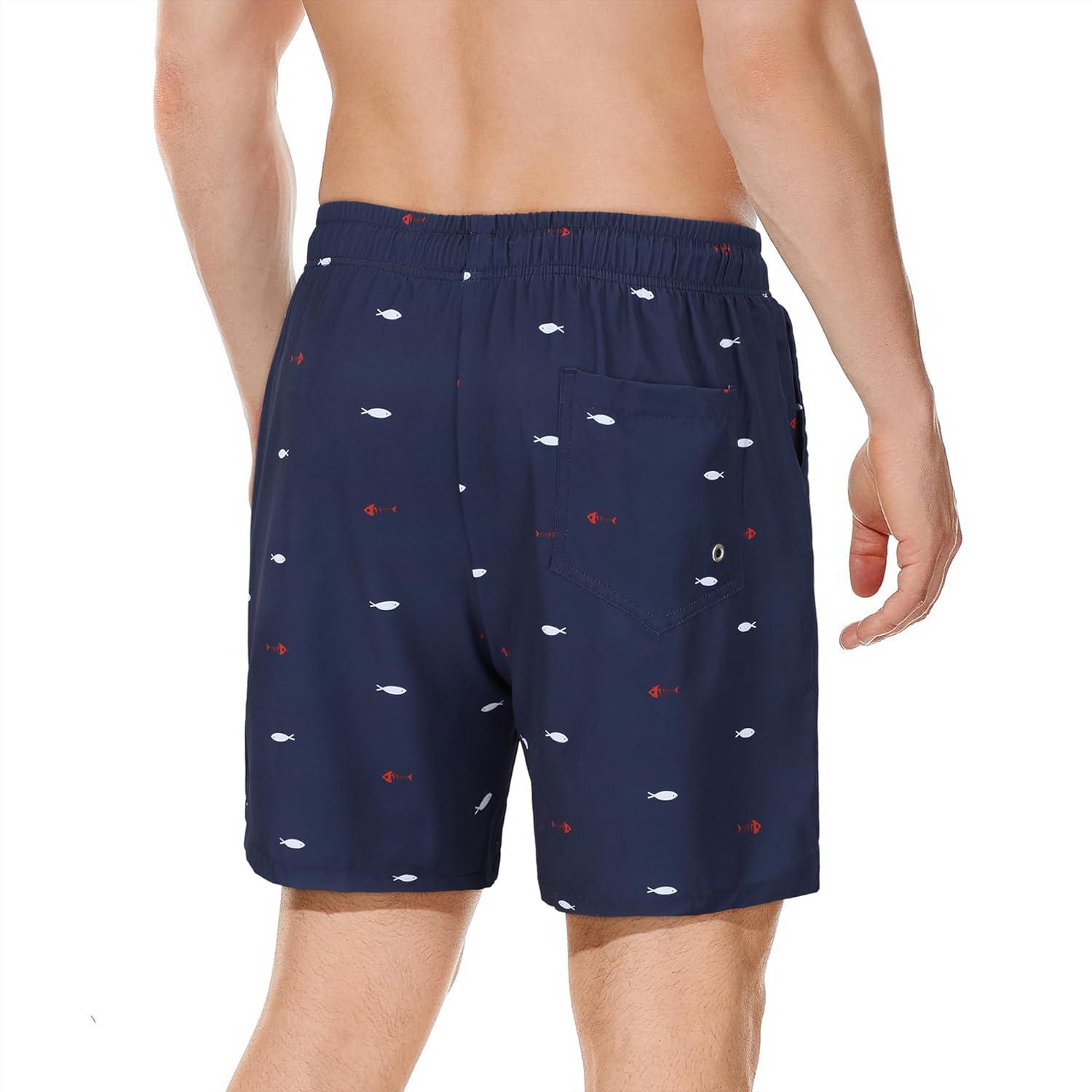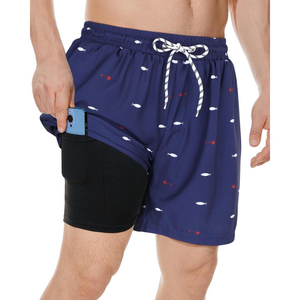 Mens Swim Trunks with Compression Liner Board Shorts for Men Quick Dry Swimsuits Bathing Suit Swimwear M-XXL(Navy Blue Fish Bone)