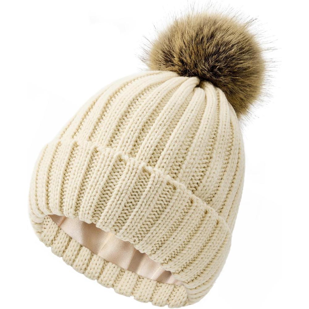 Satin Lined Beanie for Women Knit Winter Hats Silk Lined Womens Beanie with Detachable Pom Pom(A Beige)