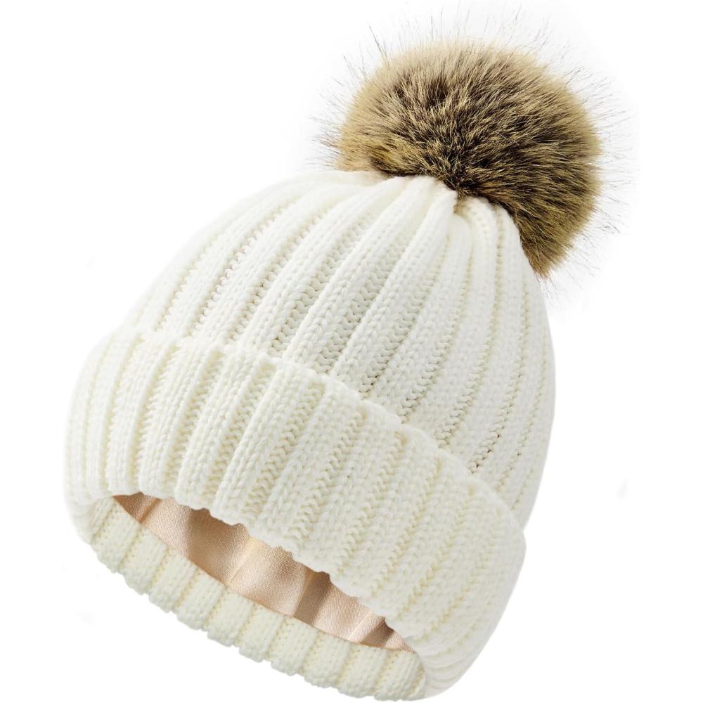 Satin Lined Beanie for Women Knit Winter Hats Silk Lined Womens Beanie with Detachable Pom Pom(A White)
