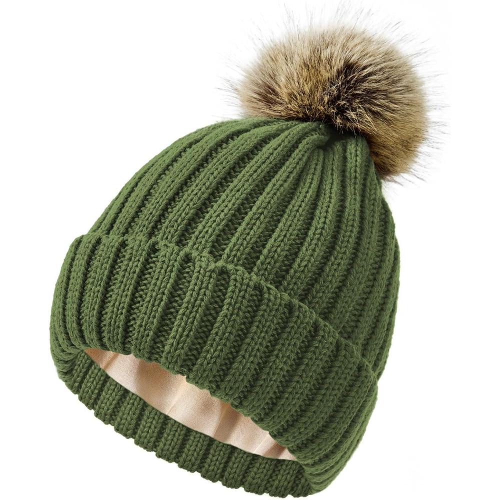 Satin Lined Beanie for Women Knit Winter Hats Silk Lined Womens Beanie with Detachable Pom Pom(Olive Green)