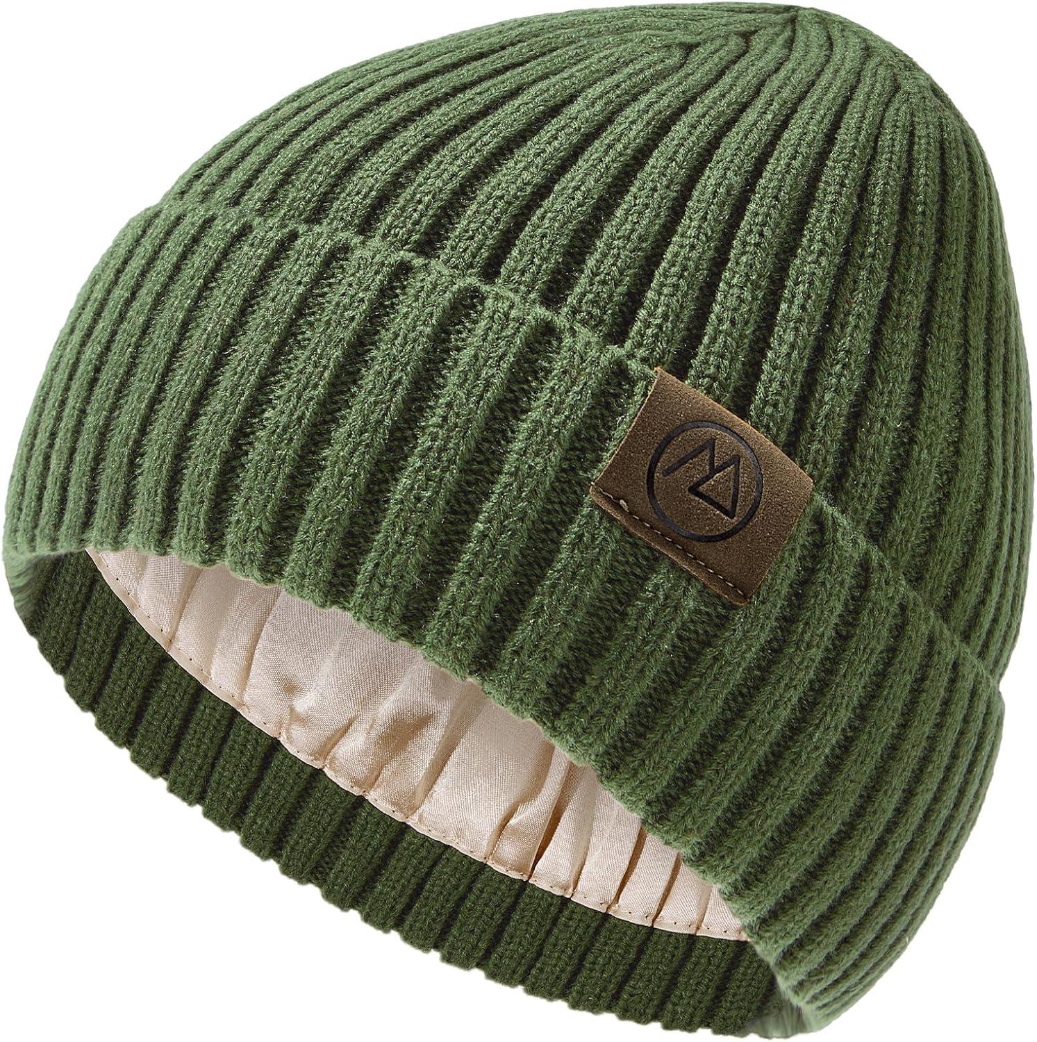 Satin Lined Beanie Women-Winter Hats for Women Silk Lined Beanie Cute Warm Knit Cuffed Hat Snow Ski Cap(Olive Green)