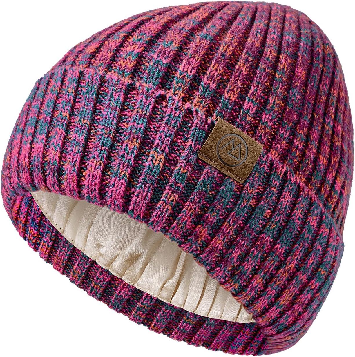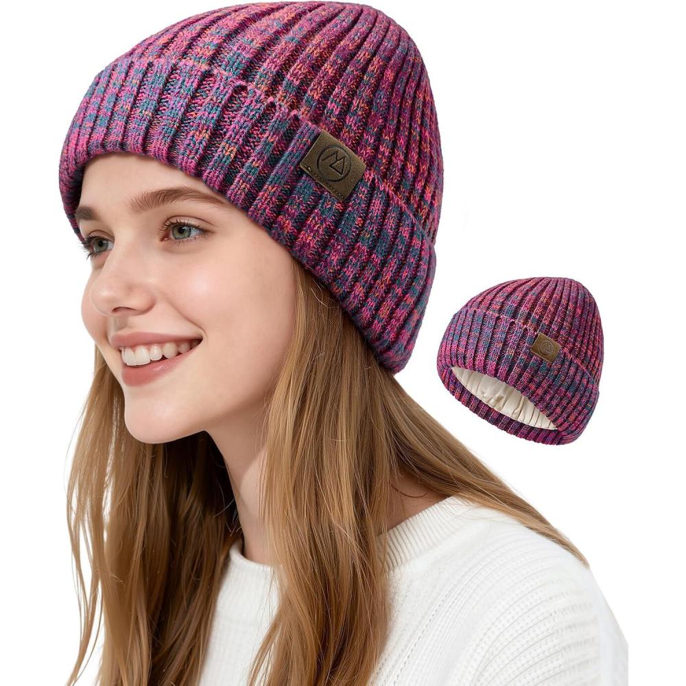 Satin Lined Beanie Women-Winter Hats for Women Silk Lined Beanie Cute Warm Knit Cuffed Hat Snow Ski Cap(Purple Mix)