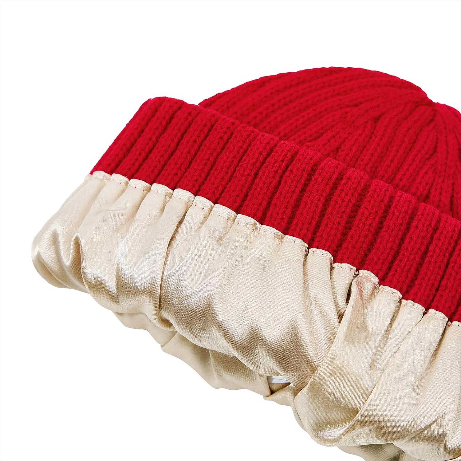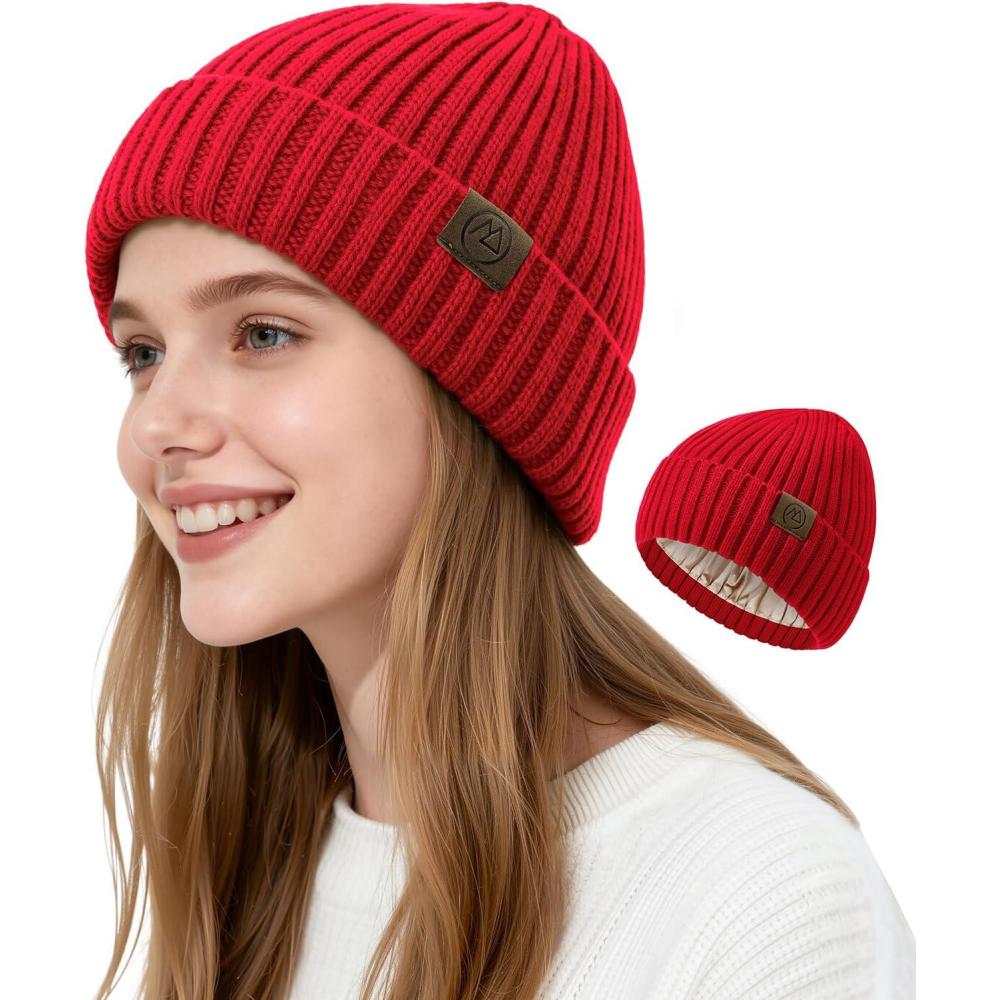 Satin Lined Beanie Women-Winter Hats for Women Silk Lined Beanie Cute Warm Knit Cuffed Hat Snow Ski Cap(Red)