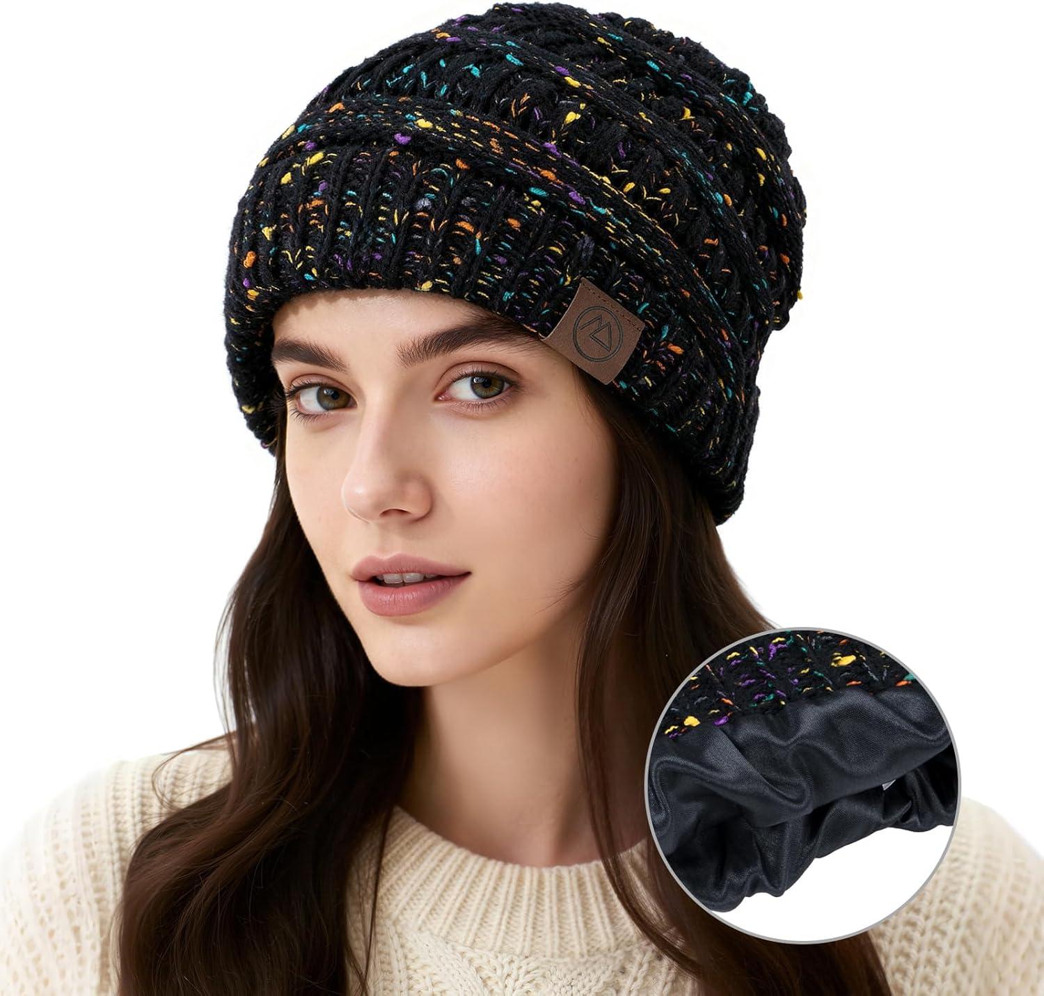 Satin Lined Beanie Women-Winter Hats for Women Silk Lined Slouchy Cute Beanie for Winter Warm Knit Ski Hat(Mix Black)