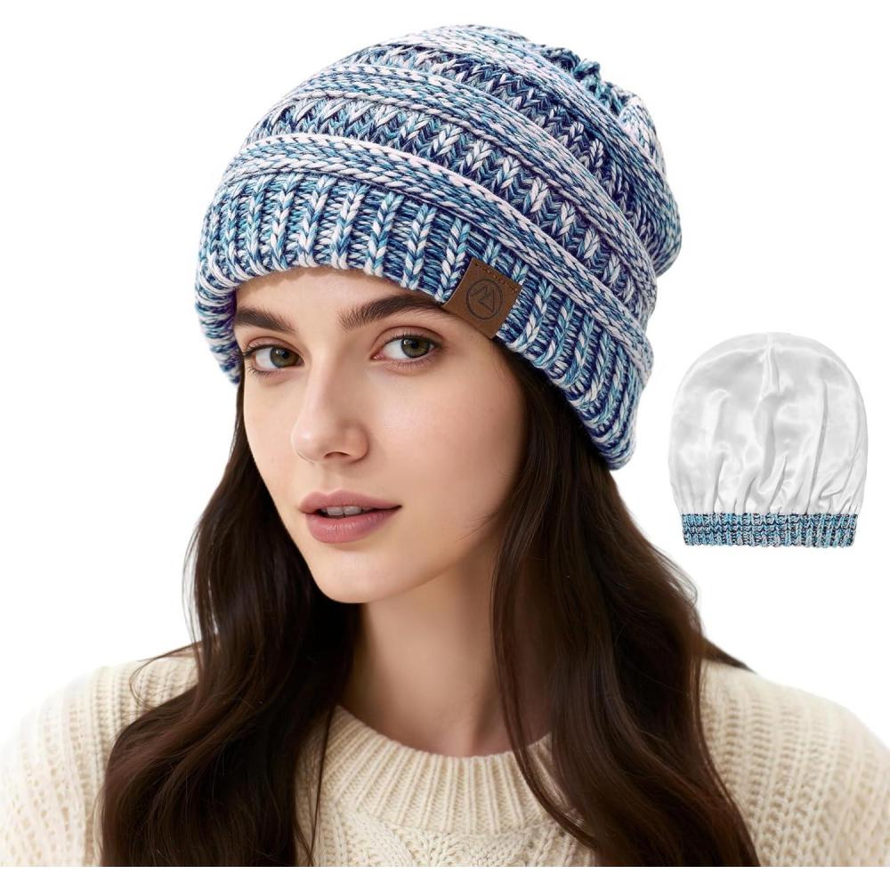Satin Lined Beanie Women-Winter Hats for Women Silk Lined Slouchy Cute Beanie for Winter Warm Knit Ski Hat(Mix Blue)