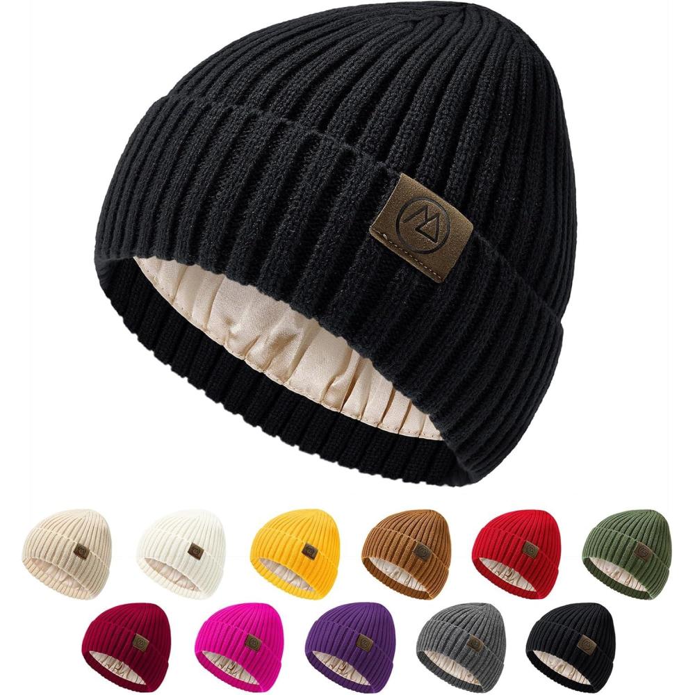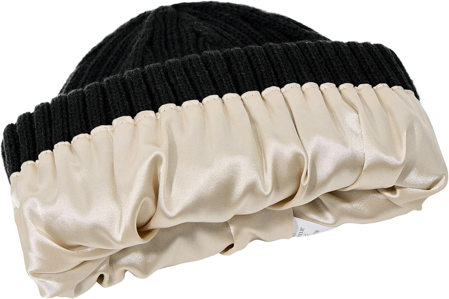Unisex Satin Lined Beanie Warm Winter Hat Silk Lined Beanie for Women Men Knit Slouchy Hat(A Black)