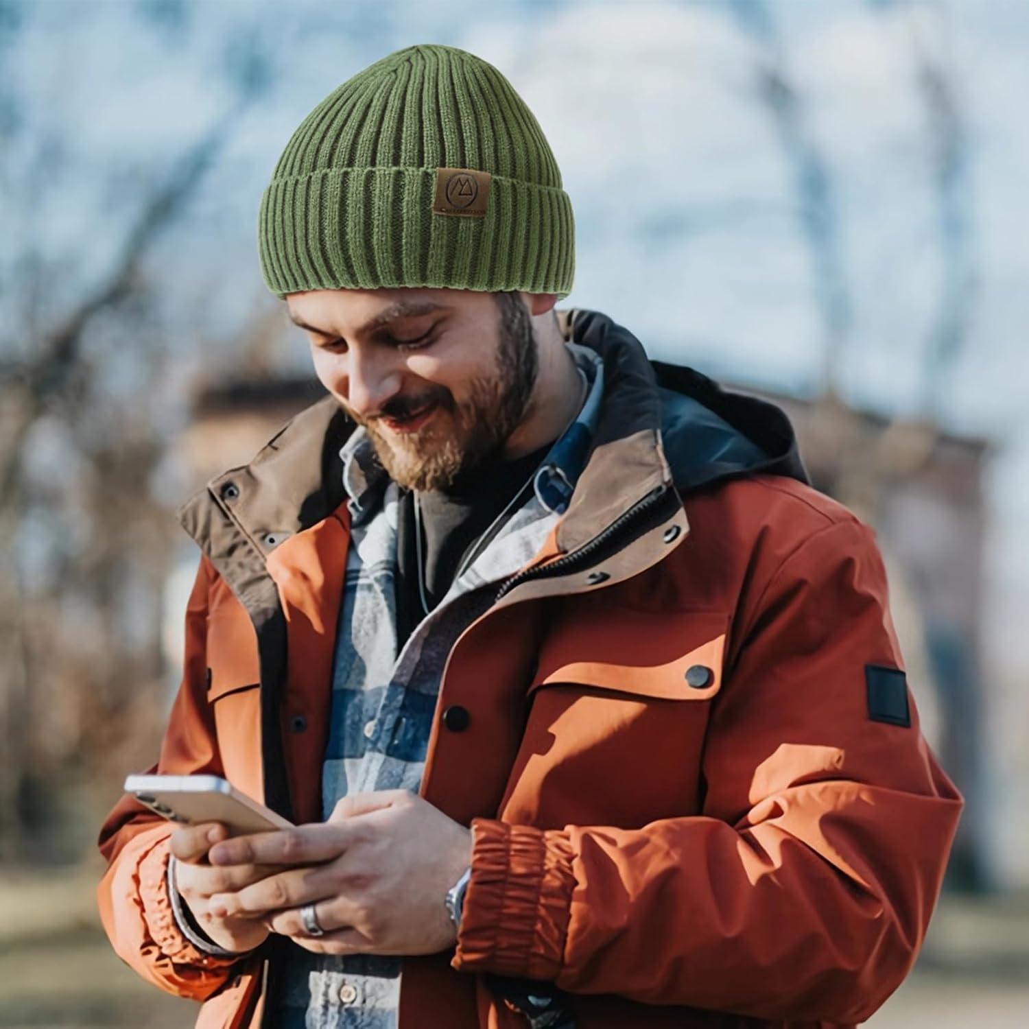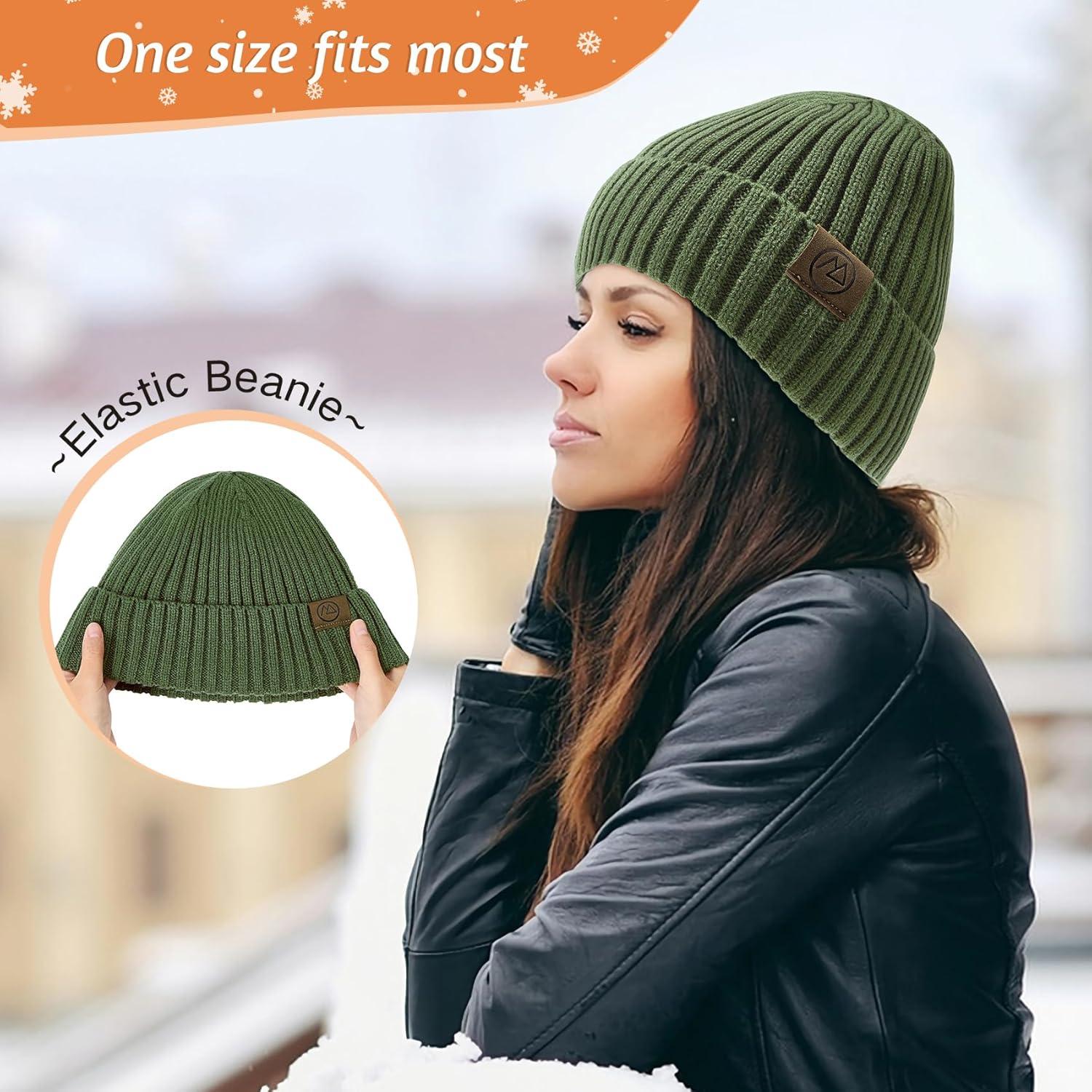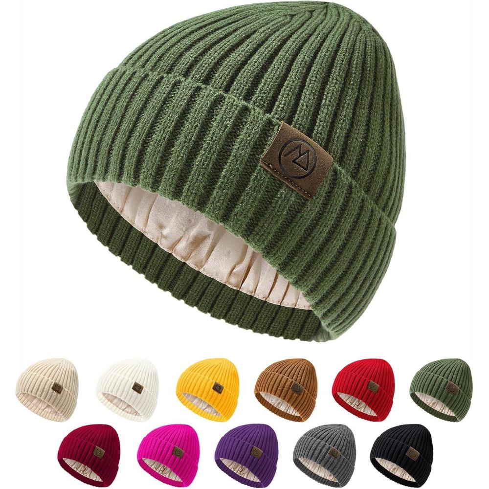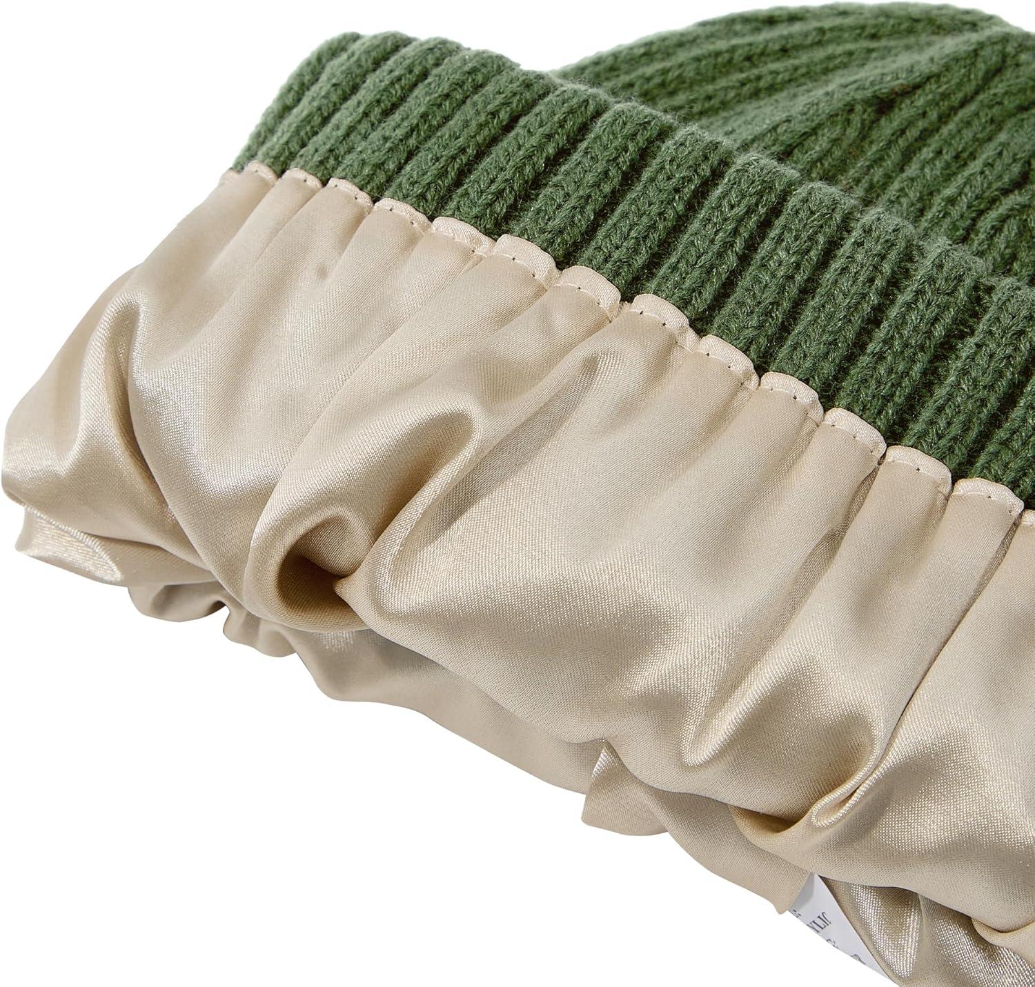Unisex Satin Lined Beanie Warm Winter Hat Silk Lined Beanie for Women Men Knit Slouchy Hat(Olive-green)