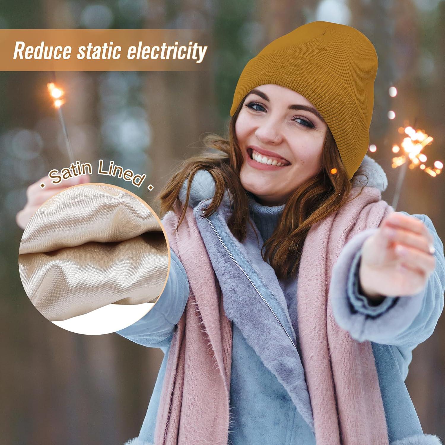 Unisex Satin & Silk Lined Slouchy Warm Winter Hat – Knit Satin Lined Beanie for Women & Men(Caramel)