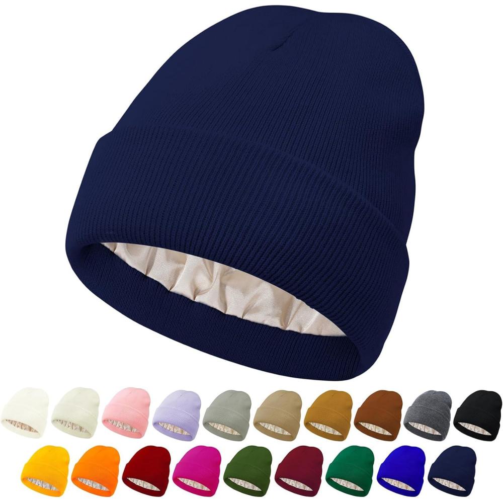 Unisex Satin & Silk Lined Slouchy Warm Winter Hat – Knit Satin Lined Beanie for Women & Men(Navy)