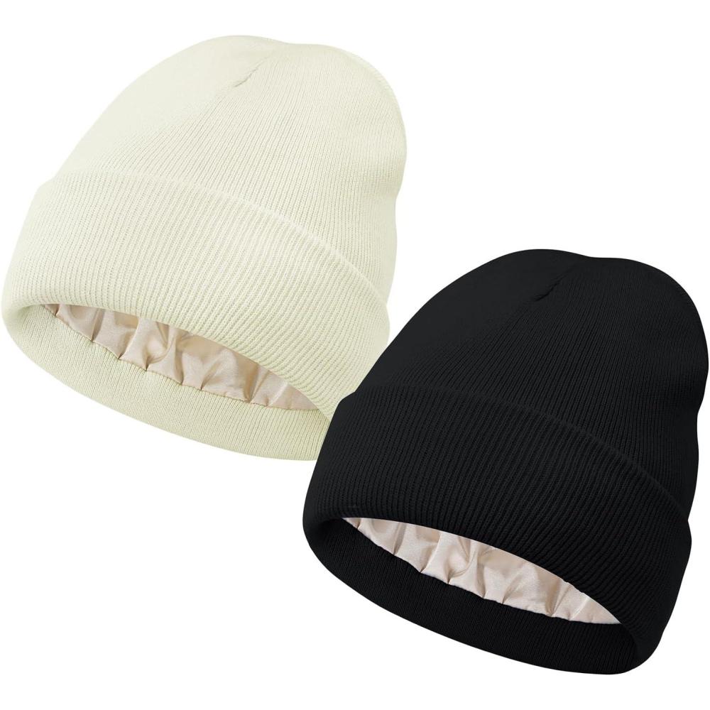 Unisex Satin & Silk Lined Slouchy Warm Winter Hat – Knit Satin Lined Beanie for Women & Men(Z 2 Black+black)