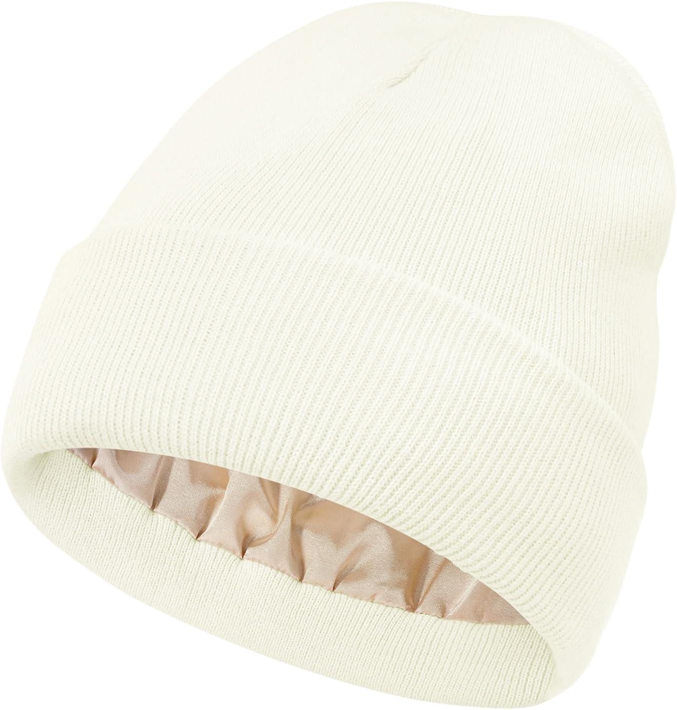 Unisex Satin & Silk Lined Slouchy Warm Winter Hat – Knit Satin Lined Beanie for Women & Men(Z 2 Black+white)