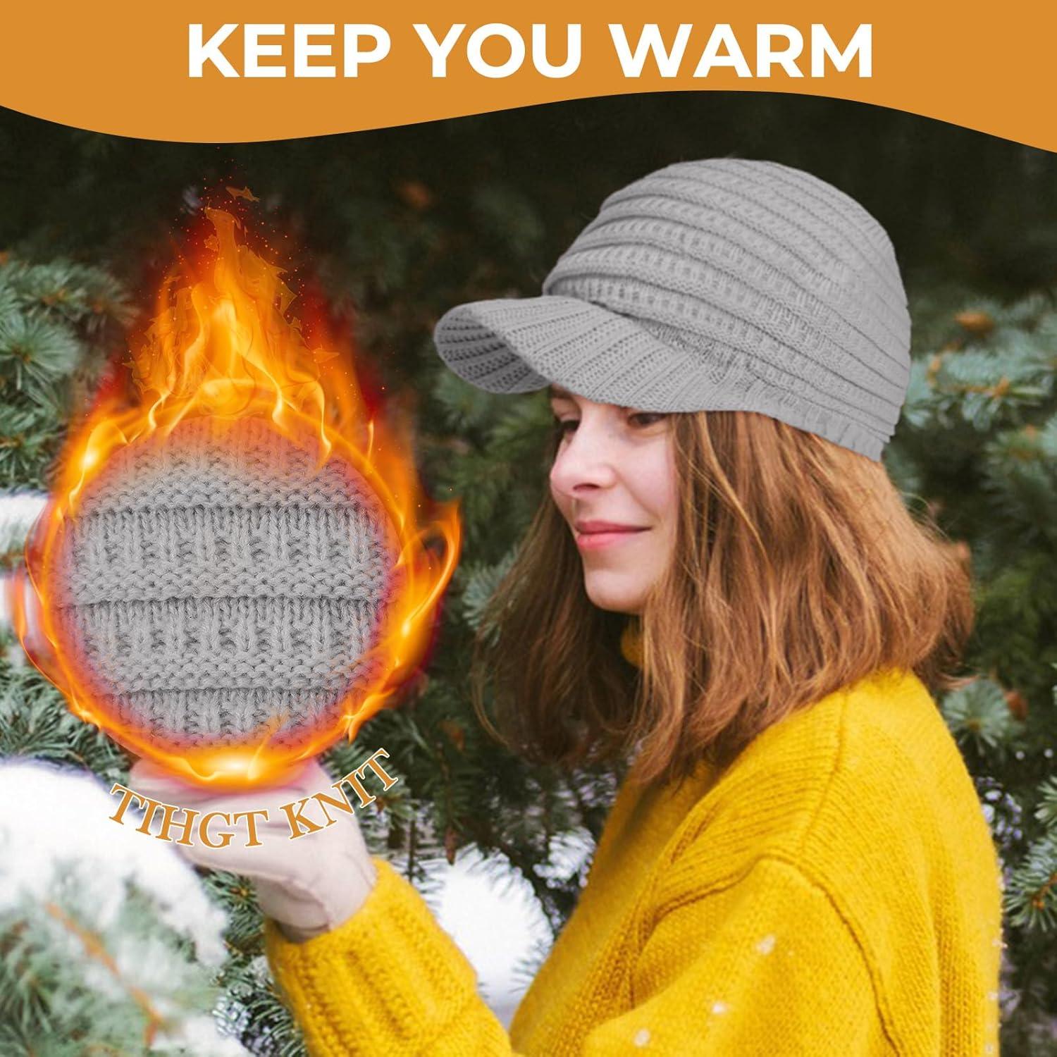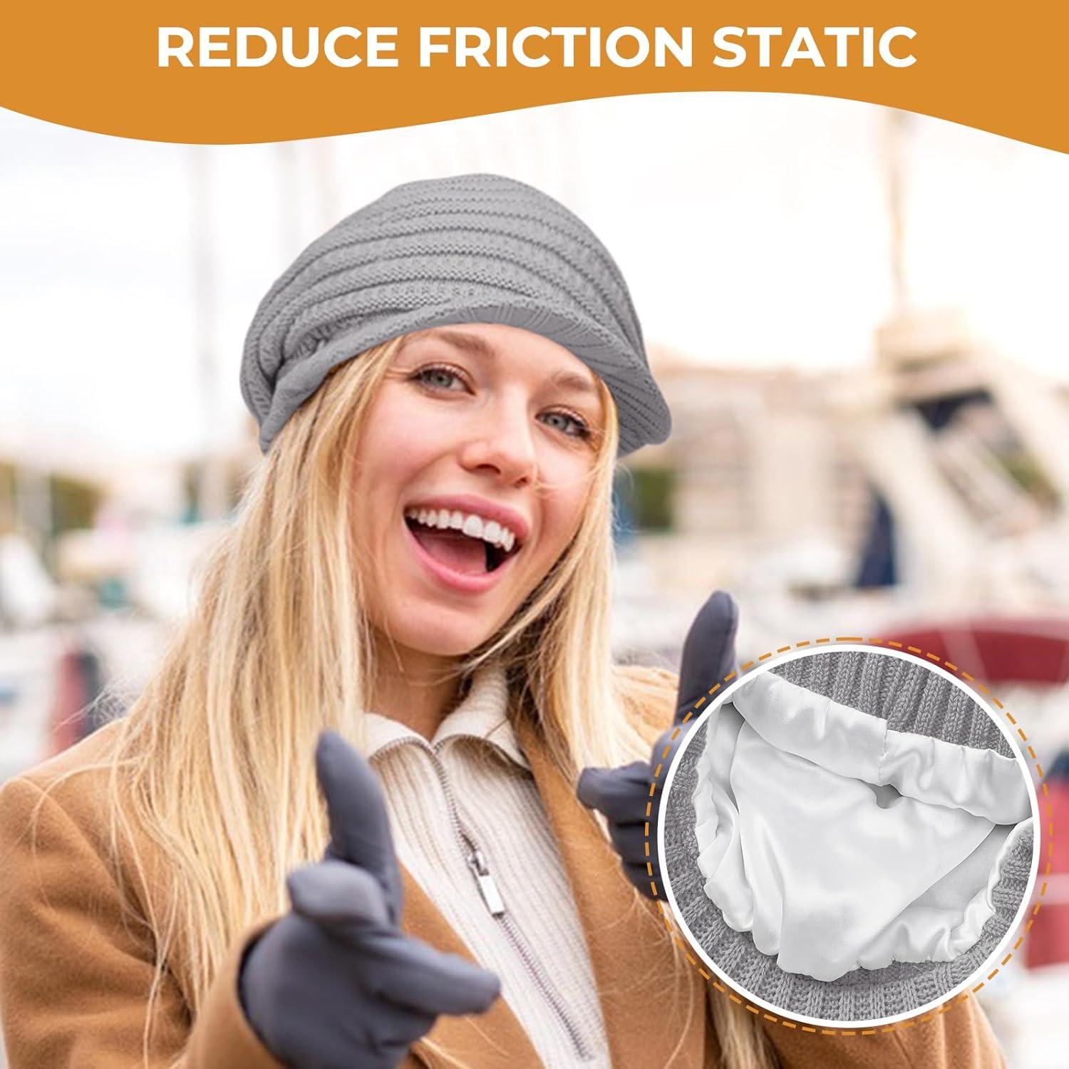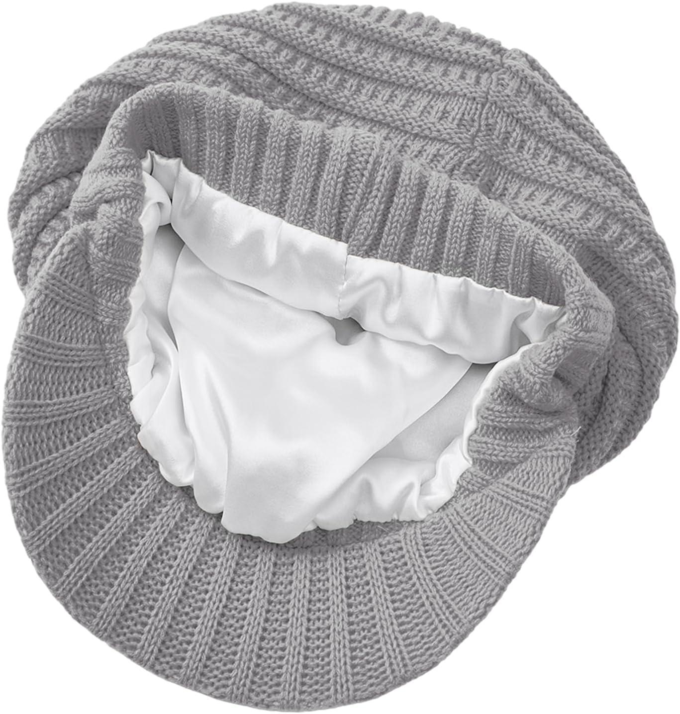Womens Satin Lined Beanie Slouchy Winter Knit Hat Newsboy Hat with Brim Silk Lined Beanie(Light-gray)