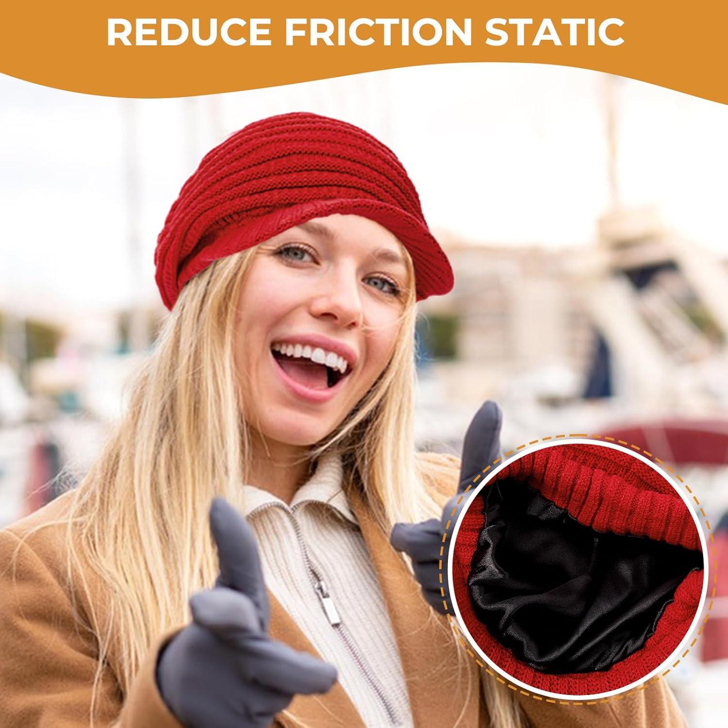 Womens Satin Lined Beanie Slouchy Winter Knit Hat Newsboy Hat with Brim Silk Lined Beanie(Mix Black)