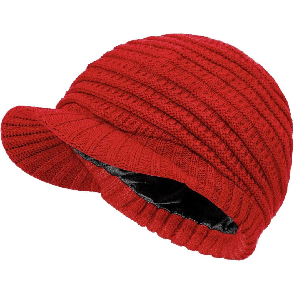 Womens Satin Lined Beanie Slouchy Winter Knit Hat Newsboy Hat with Brim Silk Lined Beanie(Red)